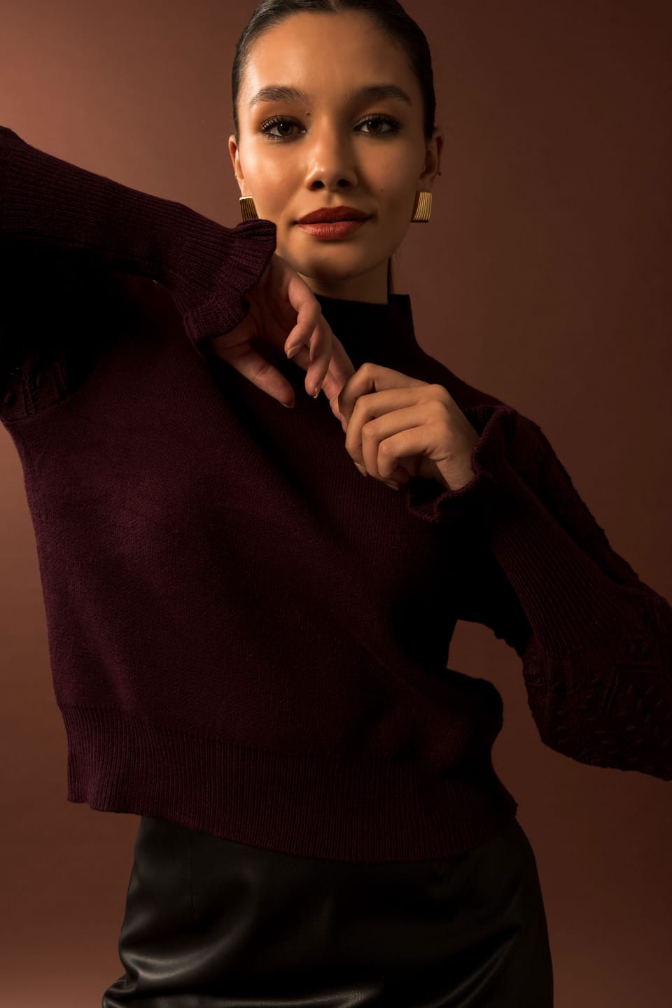 Camisola de malha com gola subida e silhueta ligeiramente cropped. O destaque da peça está nas mangas longas com textura entrançada e acabamento ondulado nos punhos, que adicionam charme e sofisticação ao visual. Contém chapa metálica personalizada com o logo na costa.
