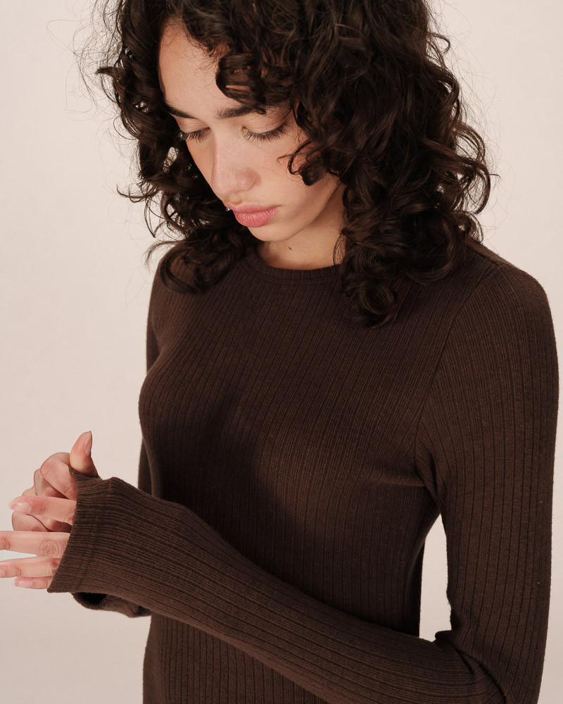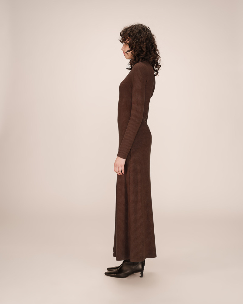 O vestido longo SORINA oferece uma silhueta feminina e descontraída. Confeccionado em jersey canelado, a peça se ajusta delicadamente às suas curvas graças ao seu corte justo. A clássica gola redonda do vestido longo SORINA é contrastada por um detalhe de decote nas costas. Com mangas longas e retas, o design representa o equilíbrio perfeito entre simplicidade e sofisticação.