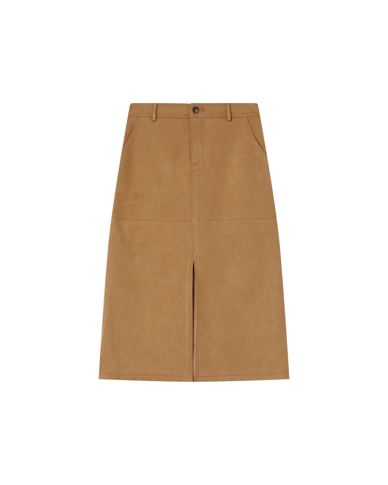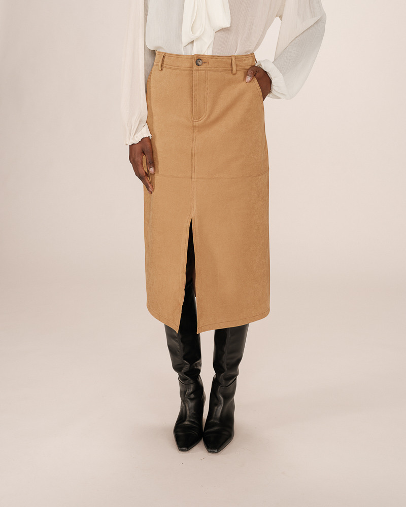 O corte midi da saia reta SORRY é combinado com um tecido de camurça para um visual feminino e elegante. O modelo é adornado com detalhes elaborados, como recortes com acabamento pespontado, que tornam a saia uma peça de forte sofisticação. A saia de camurça SORRY possui fecho de zíper, passantes para cinto e cintura alta. O modelo é forrado.