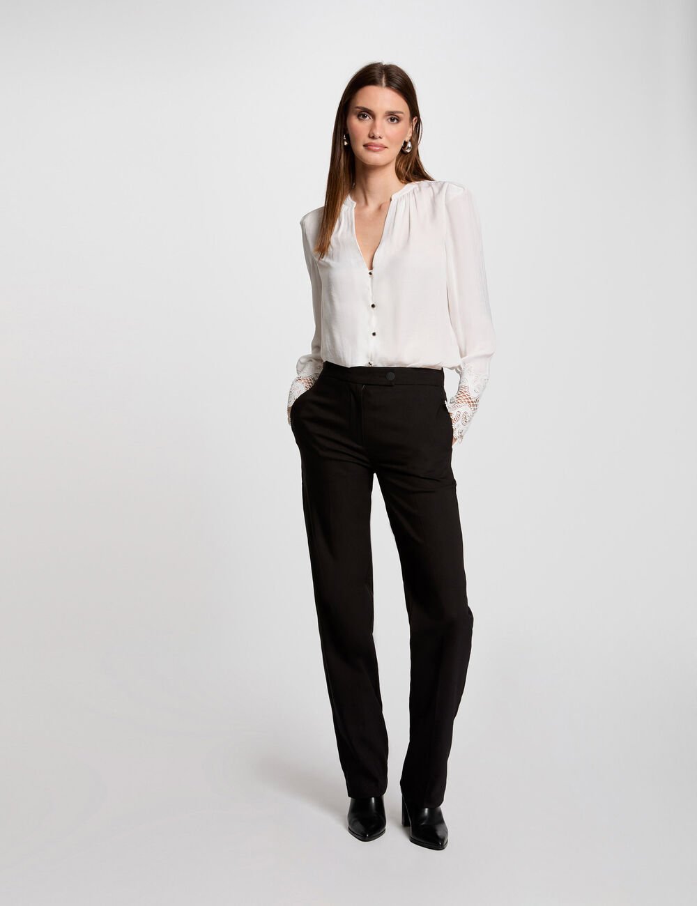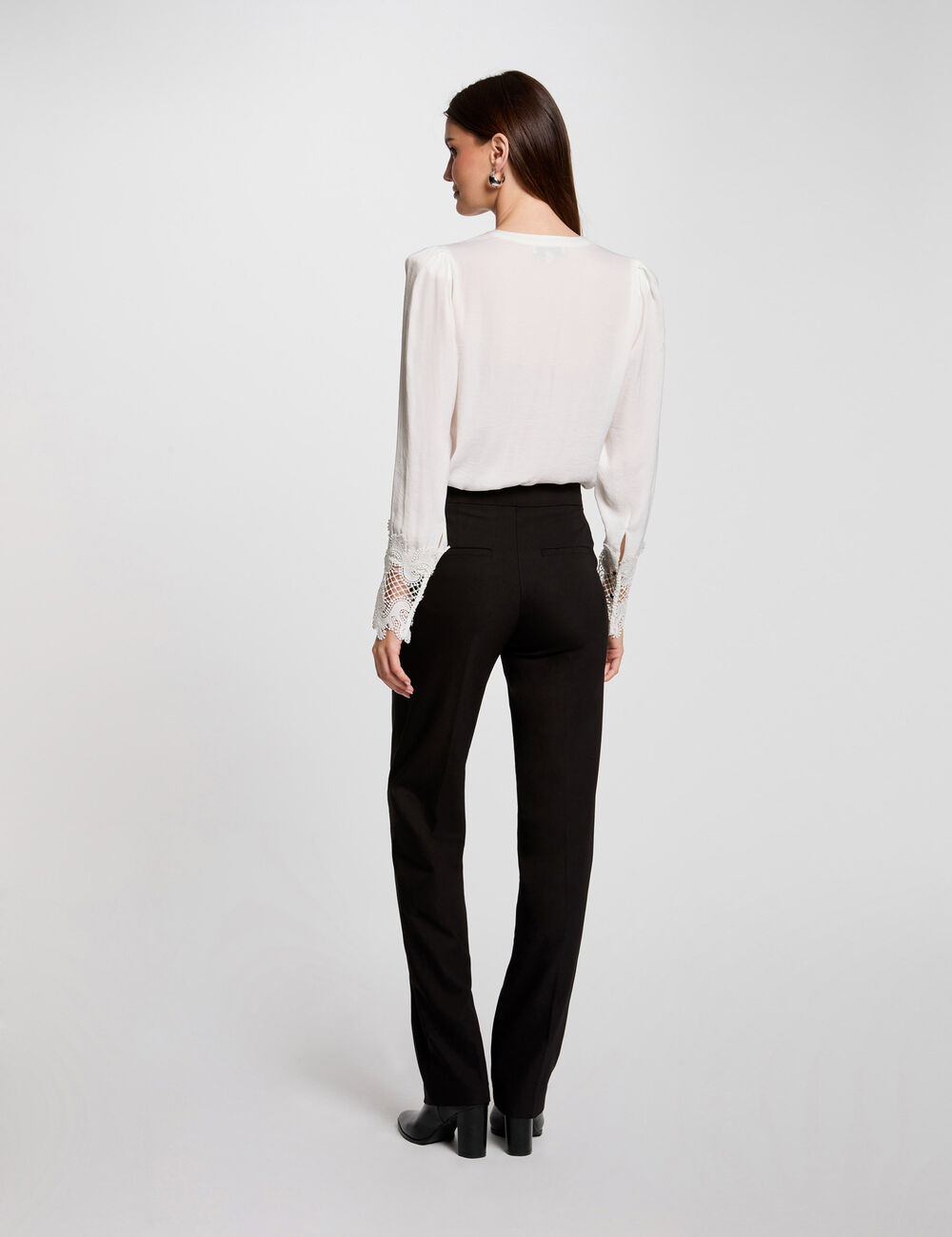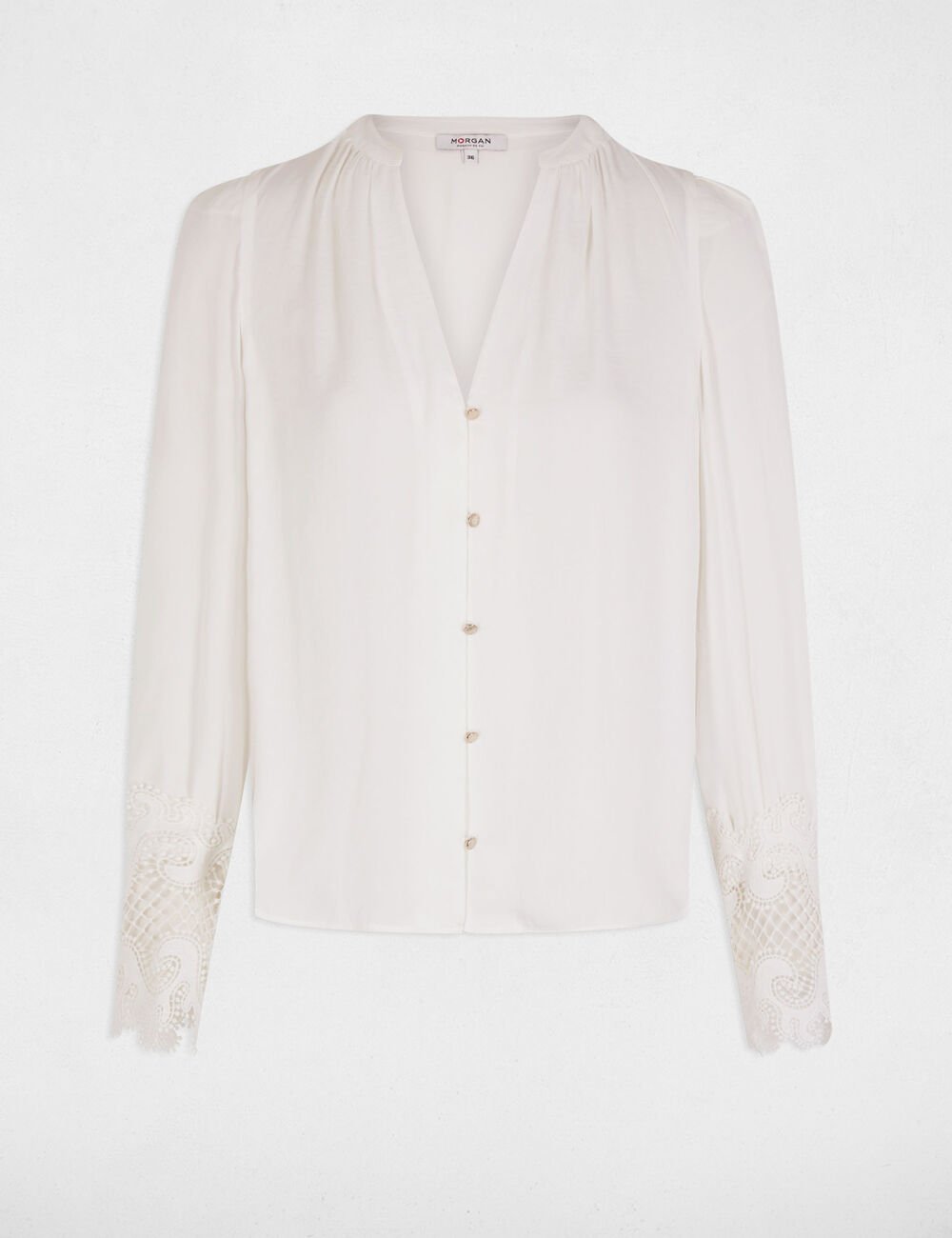 Blusa acetinada, com mangas compridas e decote em V. Corte direito. Botões na frente. Renda guipure nos punhos.