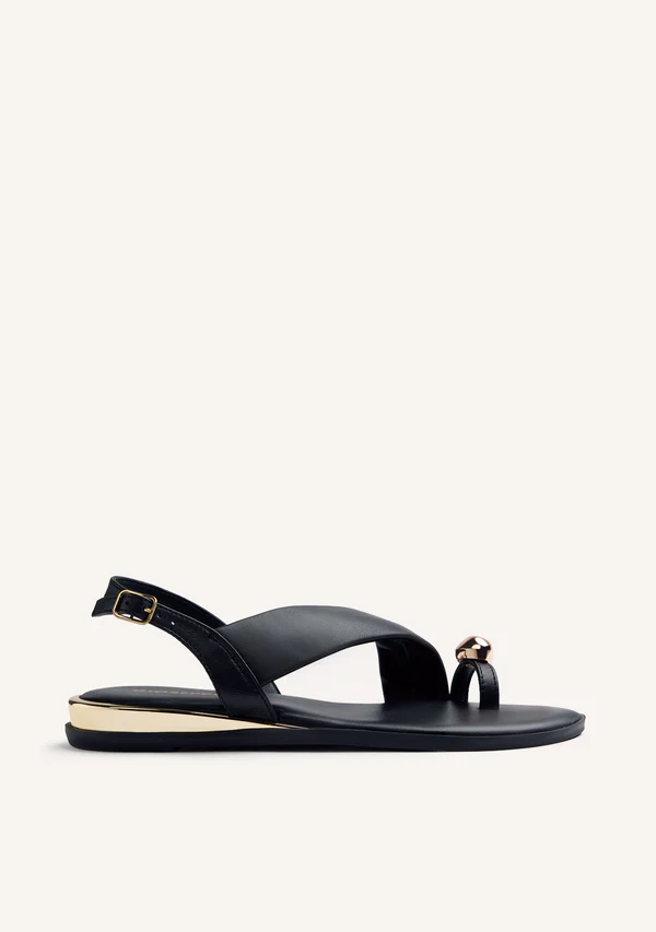 As Stony Ring Leather Sandals destacam-se pelo detalhe de anel com pedraria, que acrescenta um toque elegante e luminoso ao design. O acabamento metálico e as linhas simples criam uma peça feminina e versátil, ideal para elevar looks de verão.