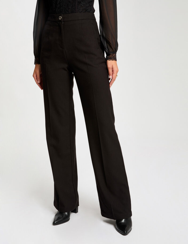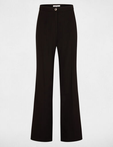 Calças com corte flare e pinças, cintura alta e 2 bolsos italianos frontais, 2 bolsos traseiros debruados