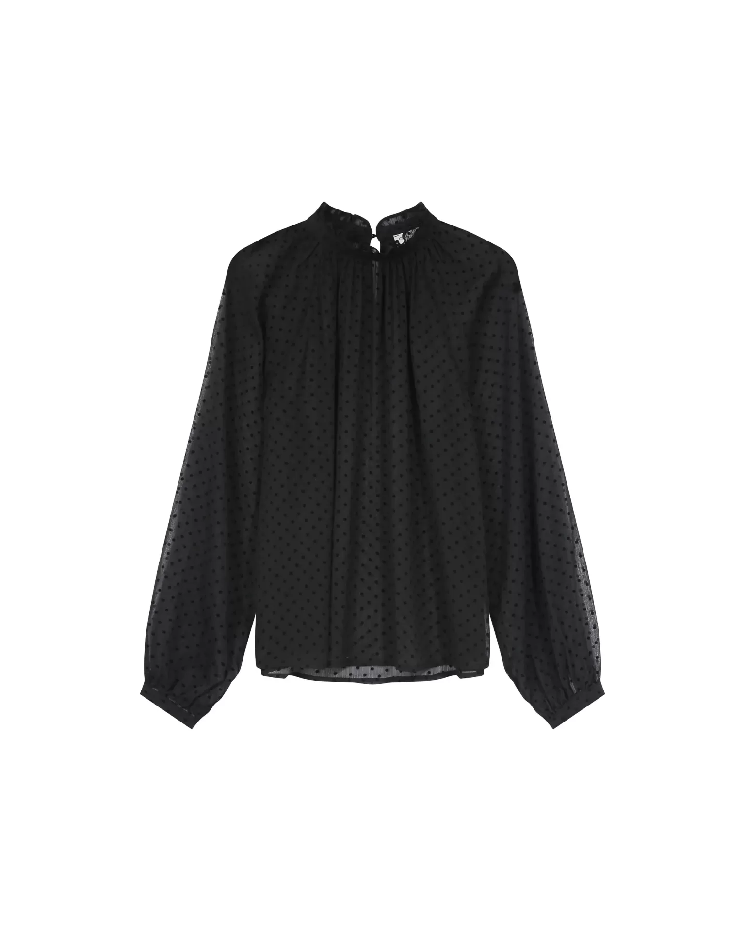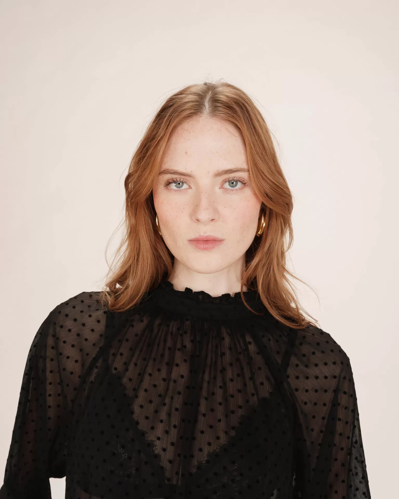 A Tailly Blouse apresenta tecido transparente com bolinhas de veludo que cria um visual sofisticado e sensual.