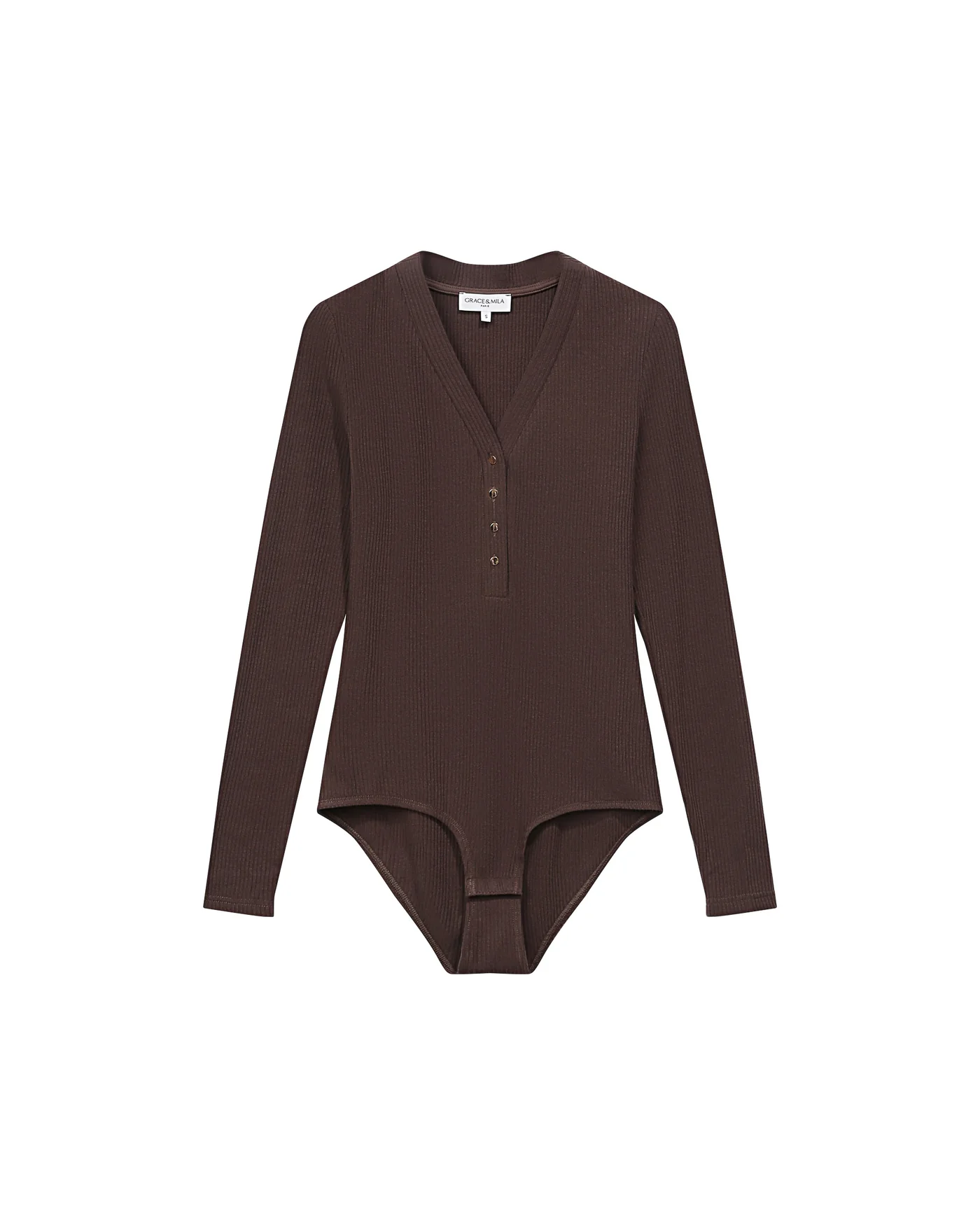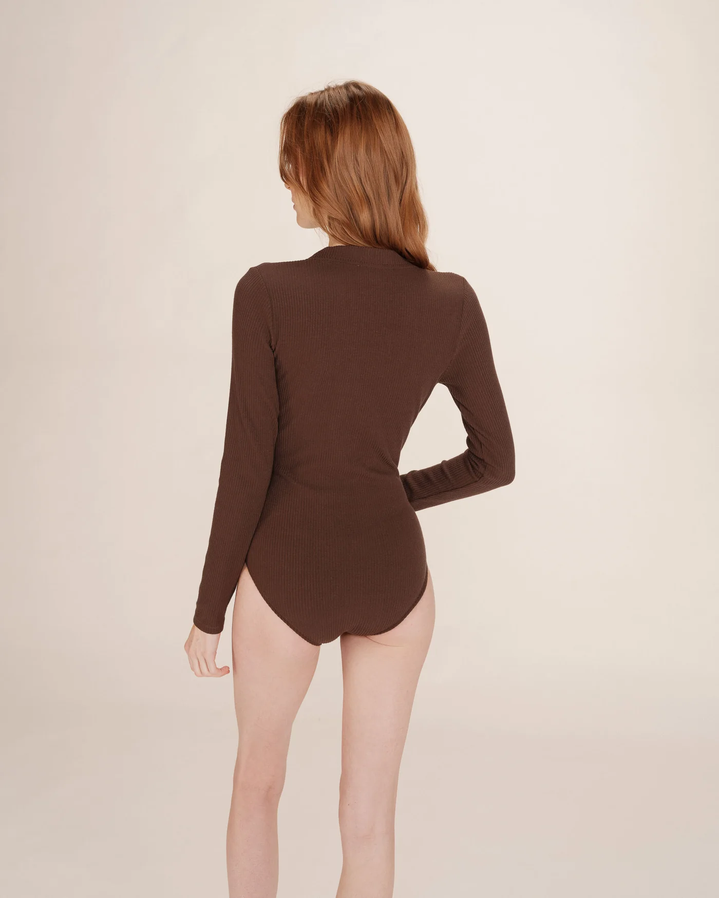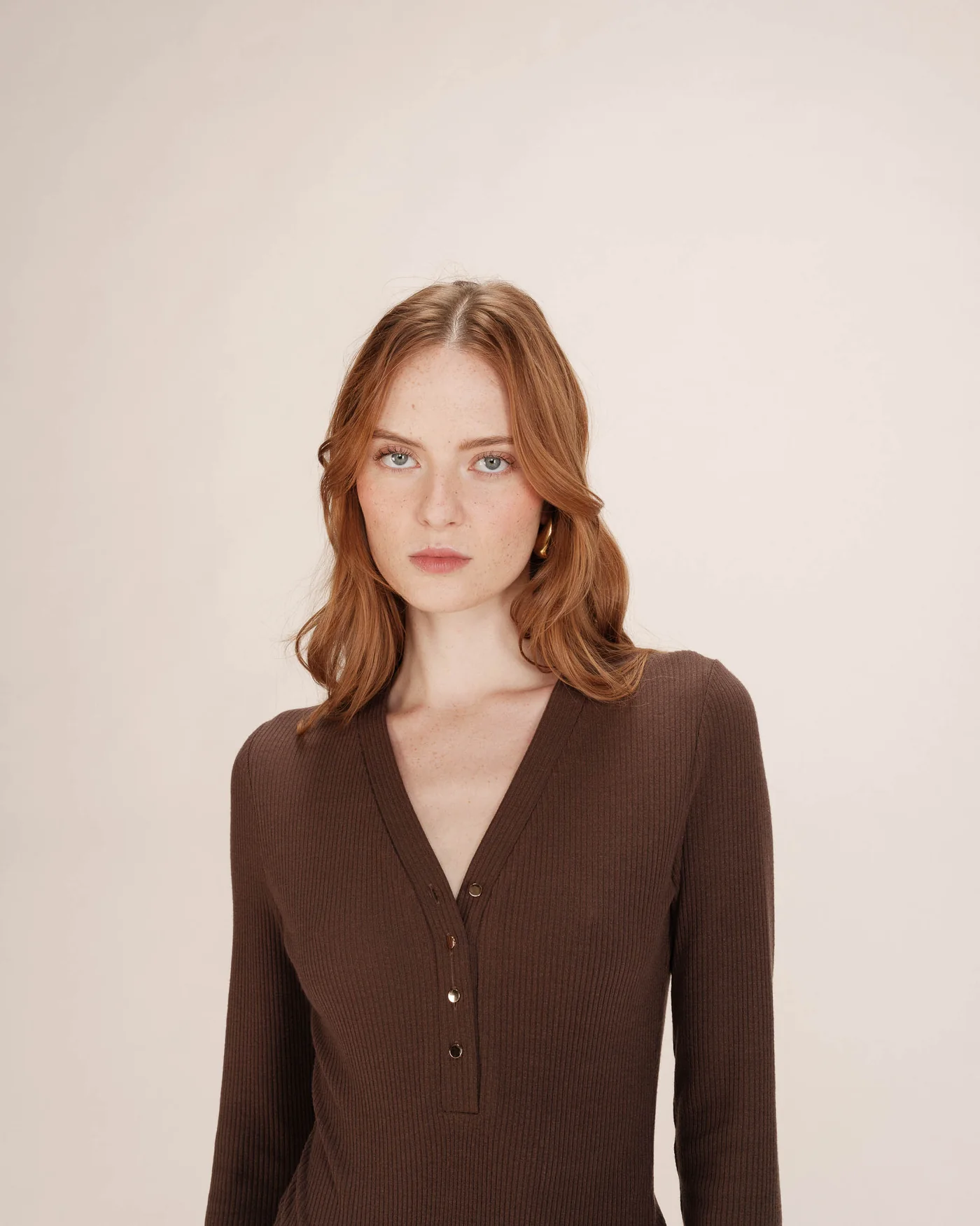 O Taro Body em malha canelada apresenta corte ajustado que valoriza a silhueta. O decote em V com botões permite ajustar a profundidade do decote.