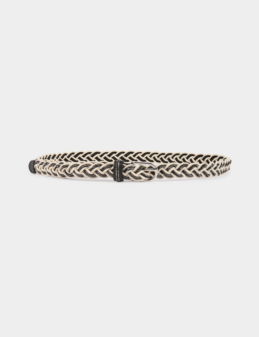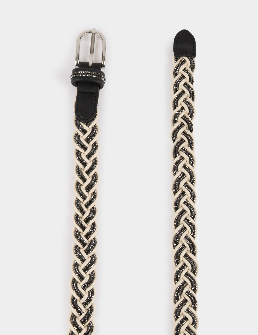Cinto efeito trança, com rhinestones e fivela de metal ajustável.