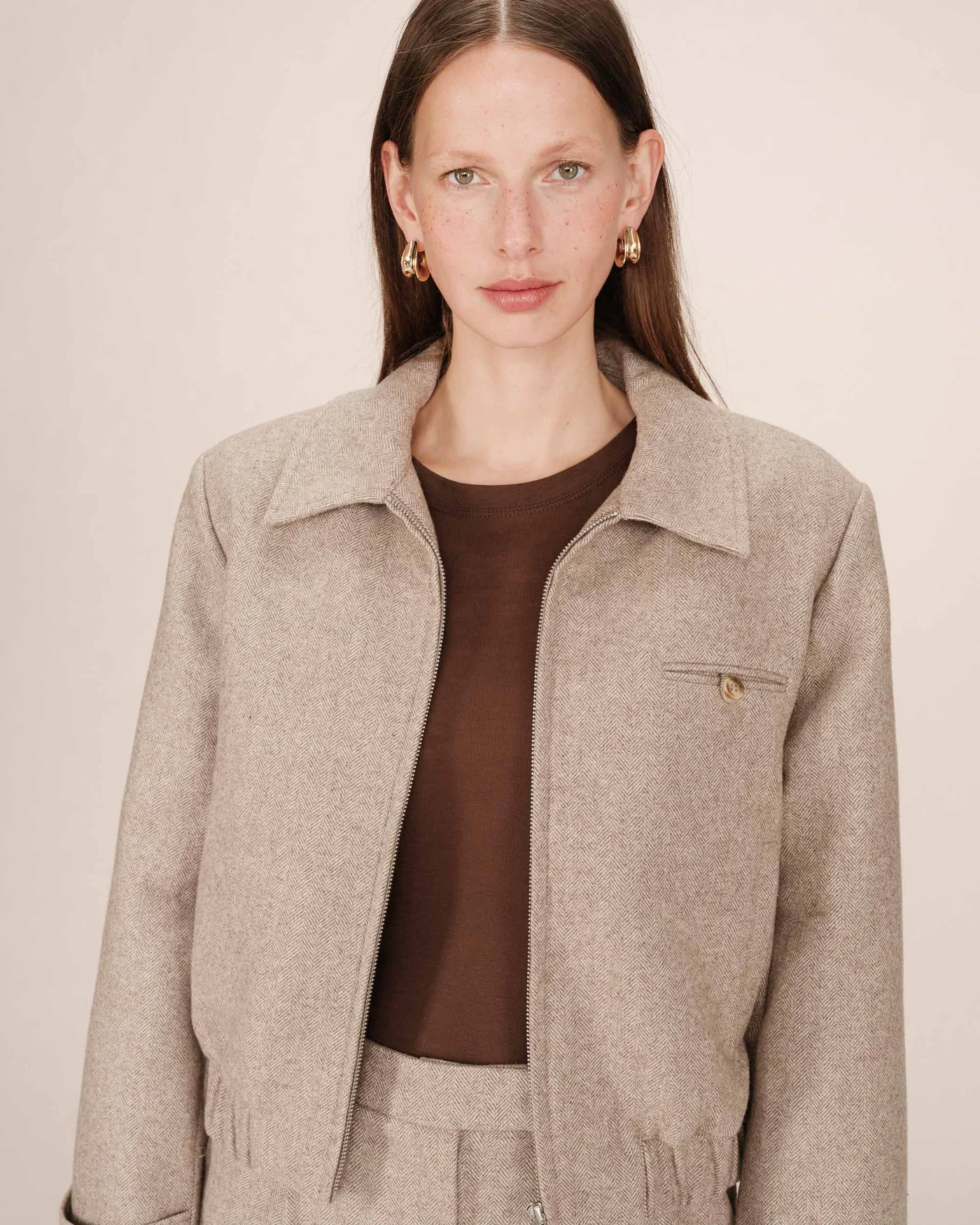 A jaqueta TIFFANY apresenta tecido em padrão espinha de peixe que cria uma silhueta estruturada e sofisticada.