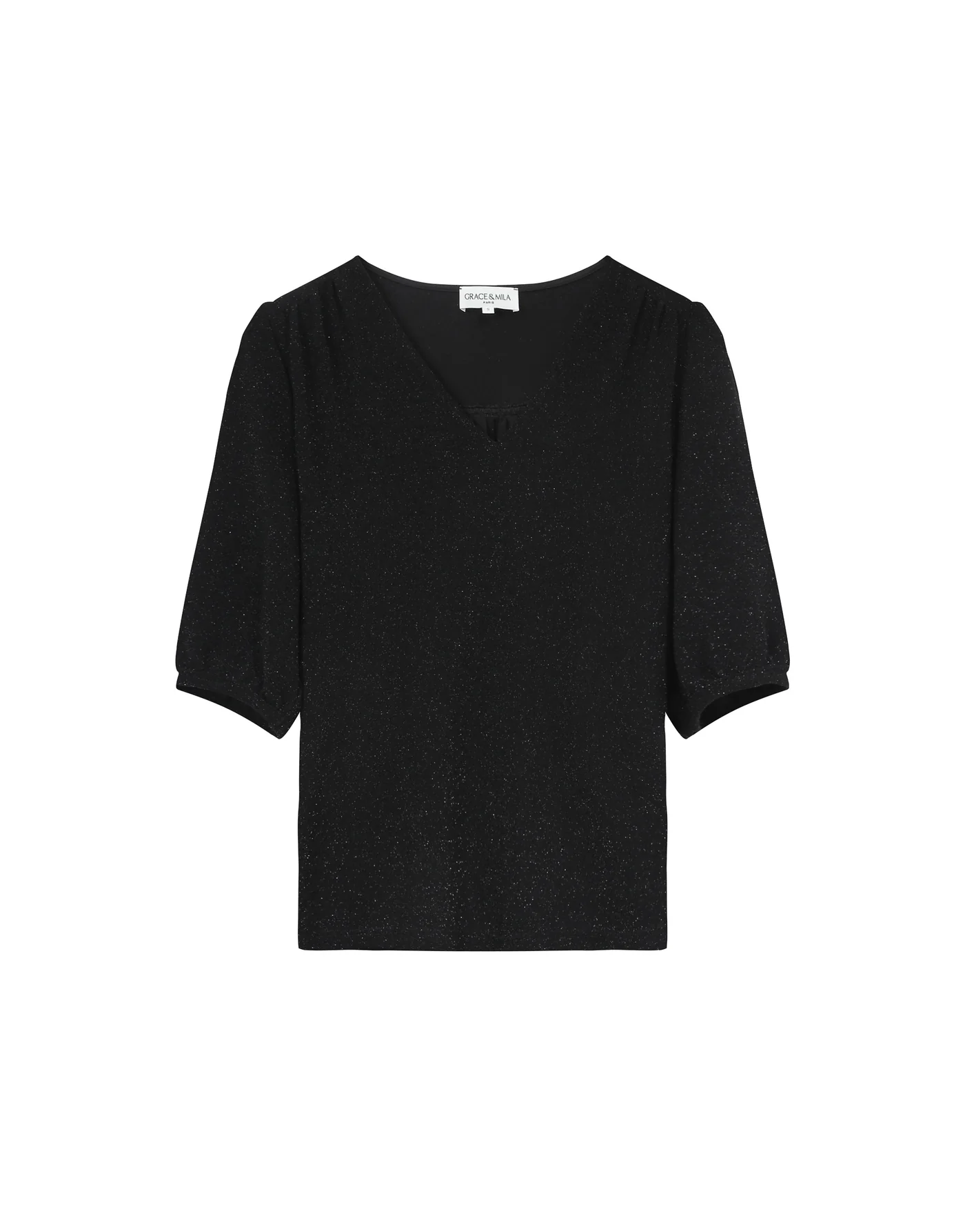A blusa TIMIDE de manga 3/4 tem corte reto, decote em V e franzidos nos ombros para um visual feminino e descontraído. Esta peça atemporal é valorizada pelo tecido com lurex, criando uma silhueta luminosa e elegante. A blusa TIMIDE com lurex é essencial em qualquer guarda-roupa, em todas as estações.