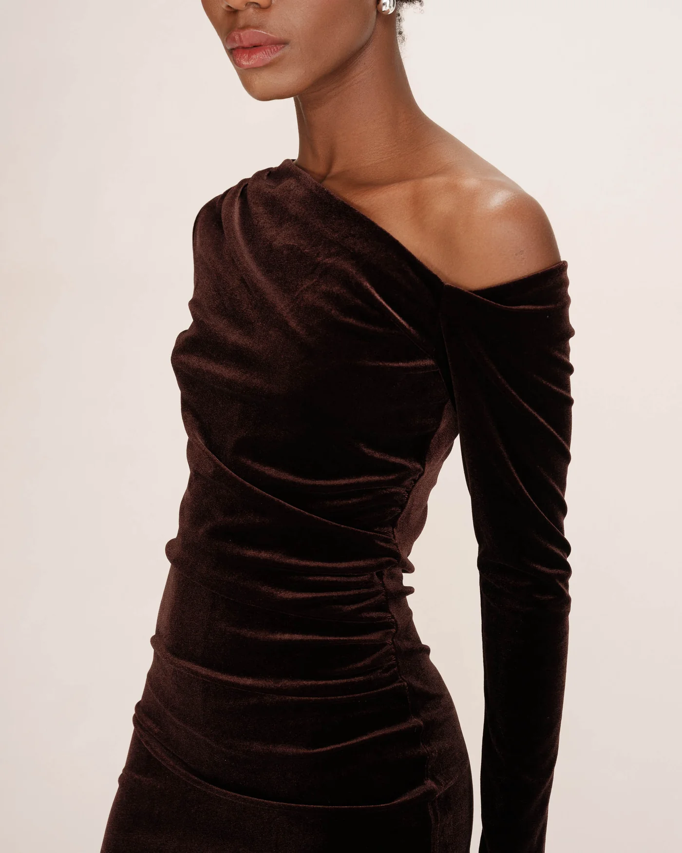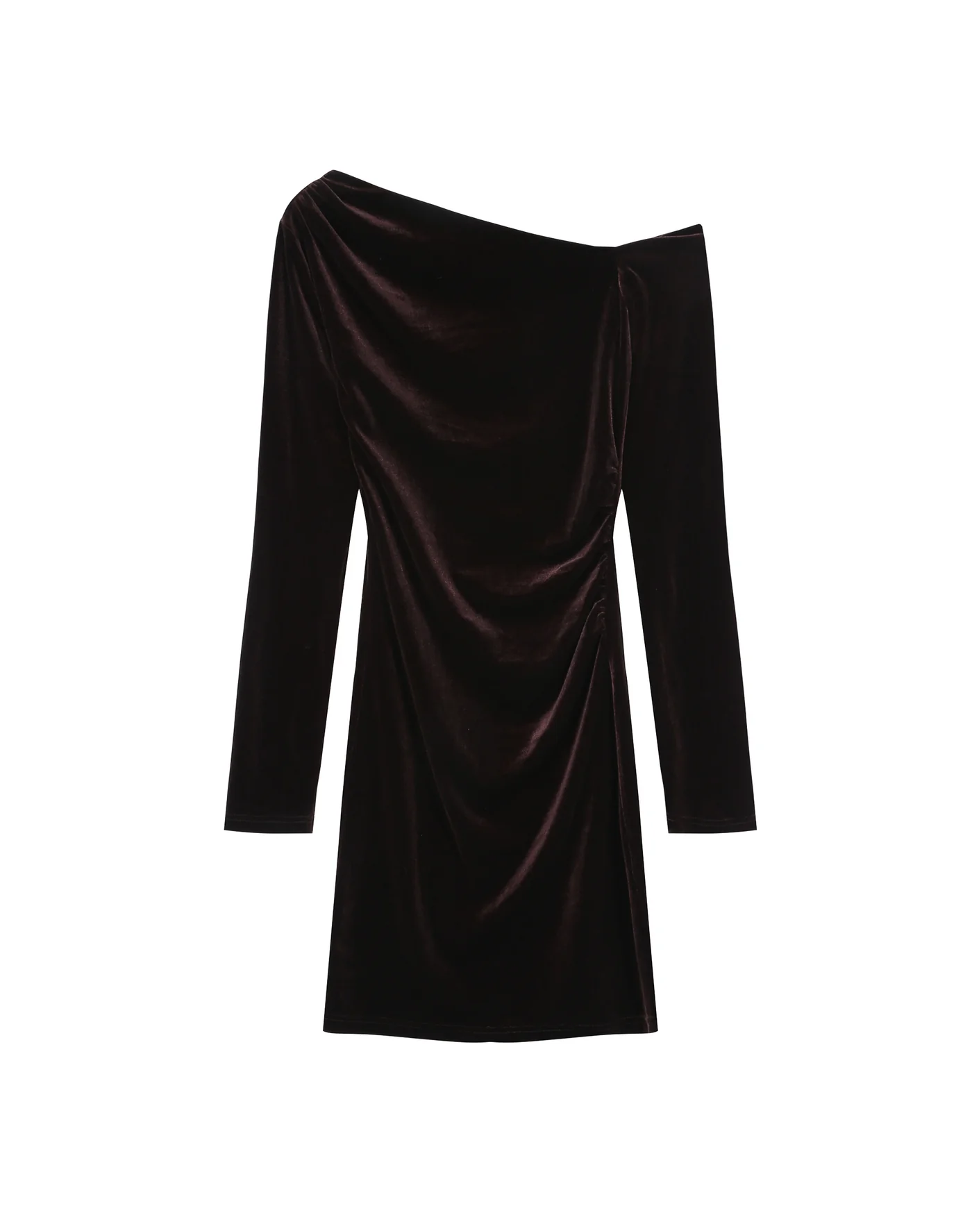 Confeccionado em veludo, o vestido curto TRINITE destaca-se pelo decote assimétrico que revela os ombros com elegância. O franzido na cintura e nos ombros cria um drapeado na parte frontal, conferindo movimento à silhueta. O vestido de veludo TRINITE é uma peça feminina e moderna, perfeita para um look chique e contemporâneo.