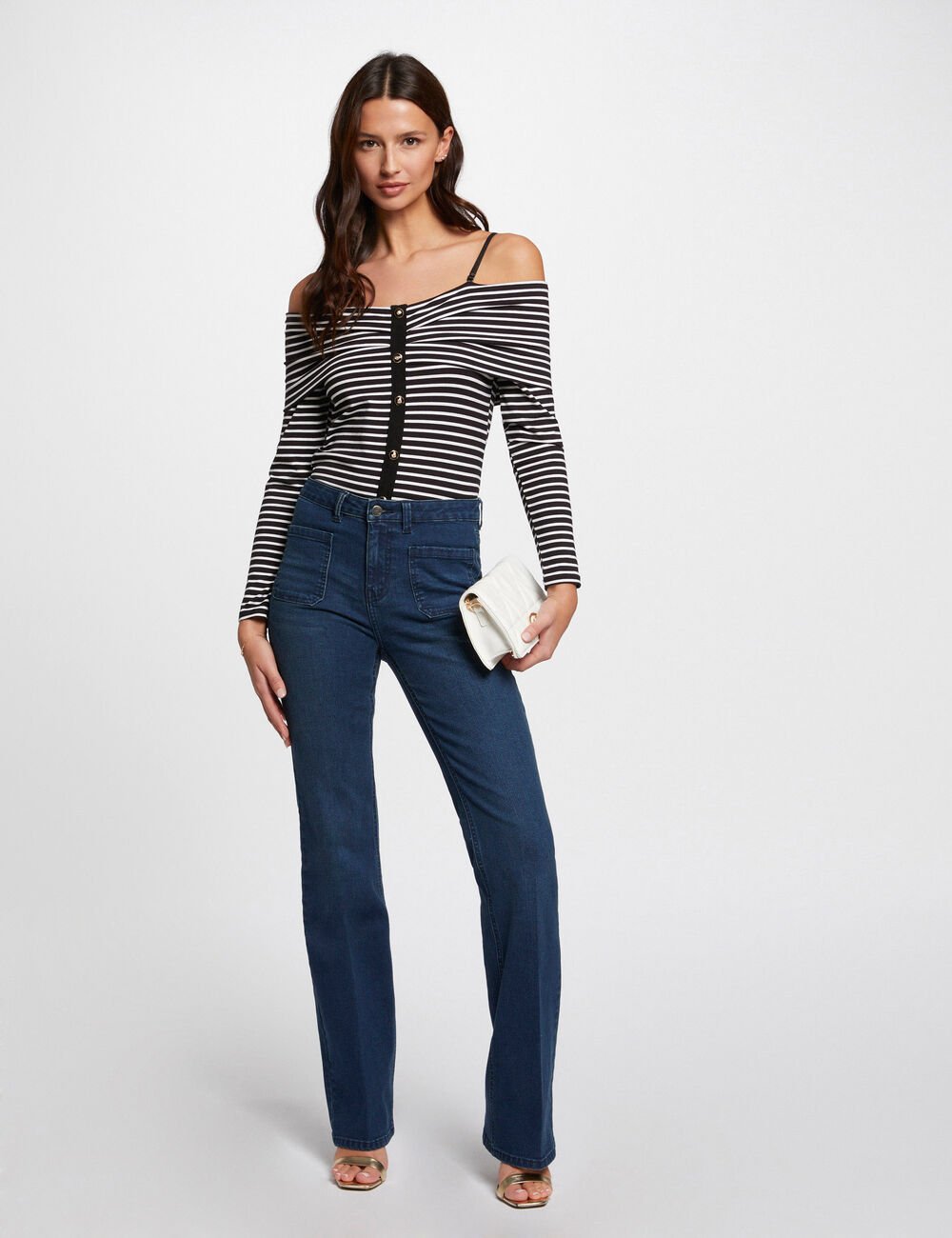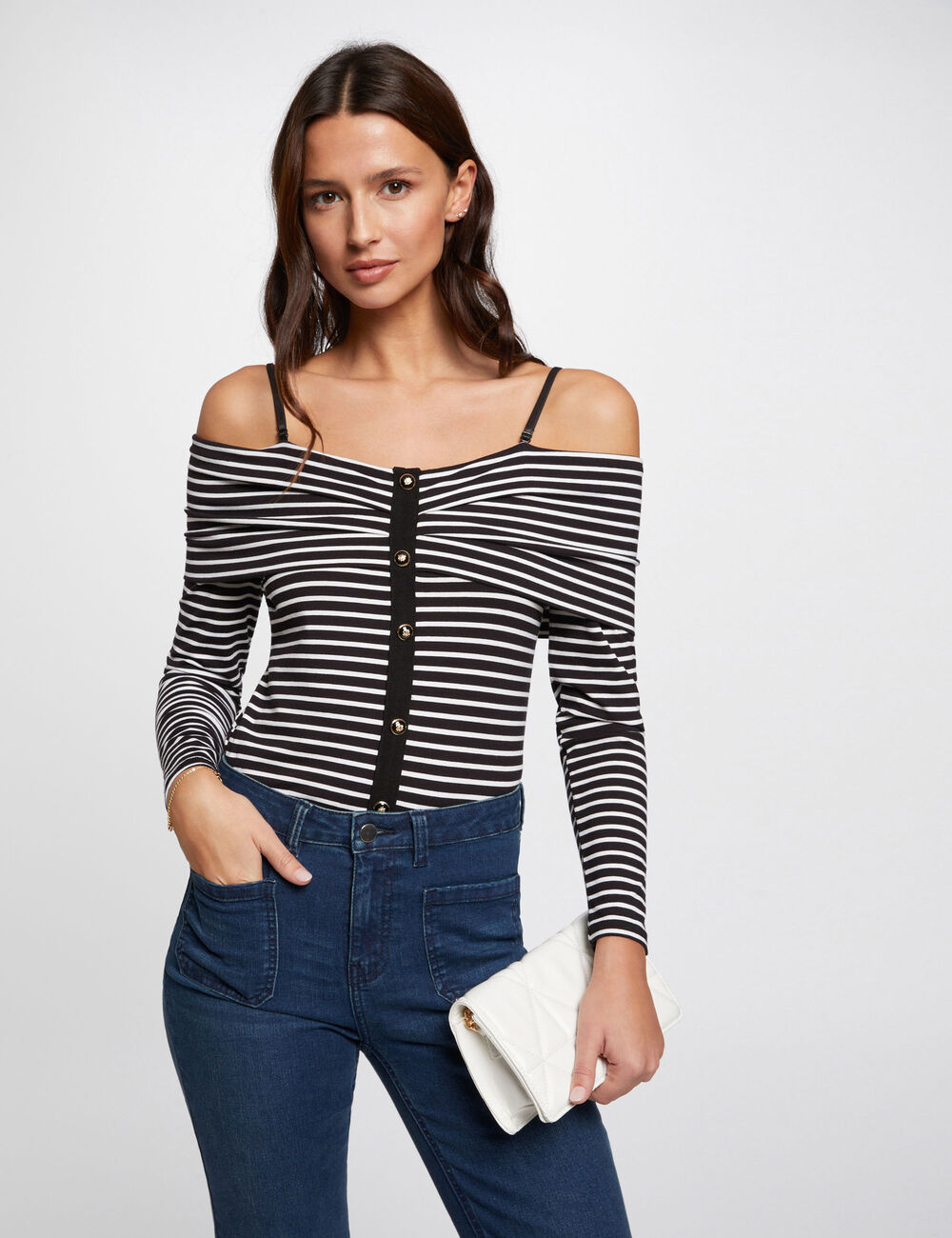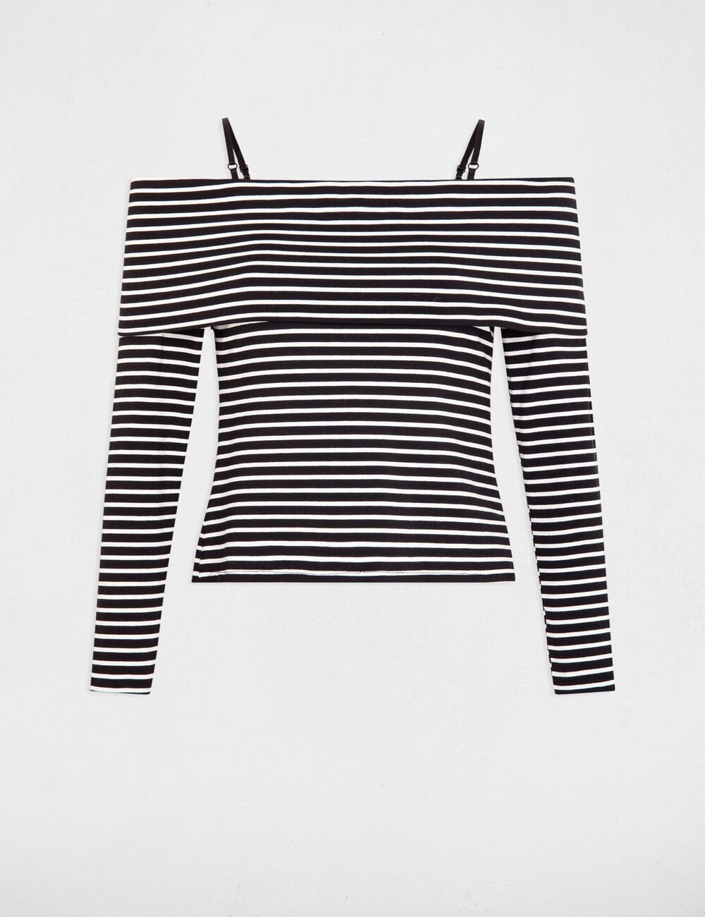 A Tropez T-Shirt apresenta design justo com riscas horizontais e decote com ombros descobertos que cria um visual moderno e feminino.