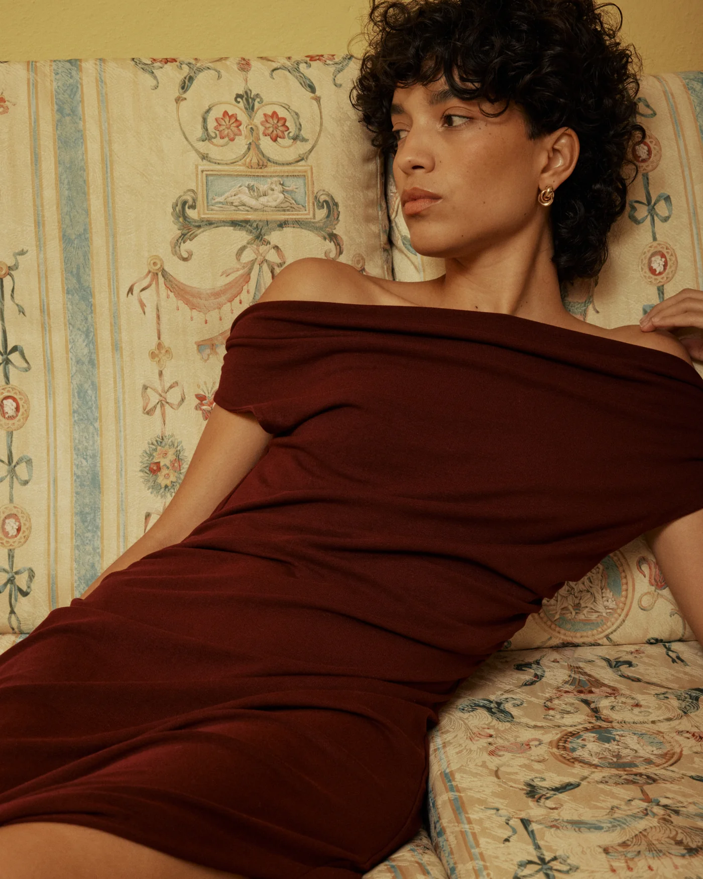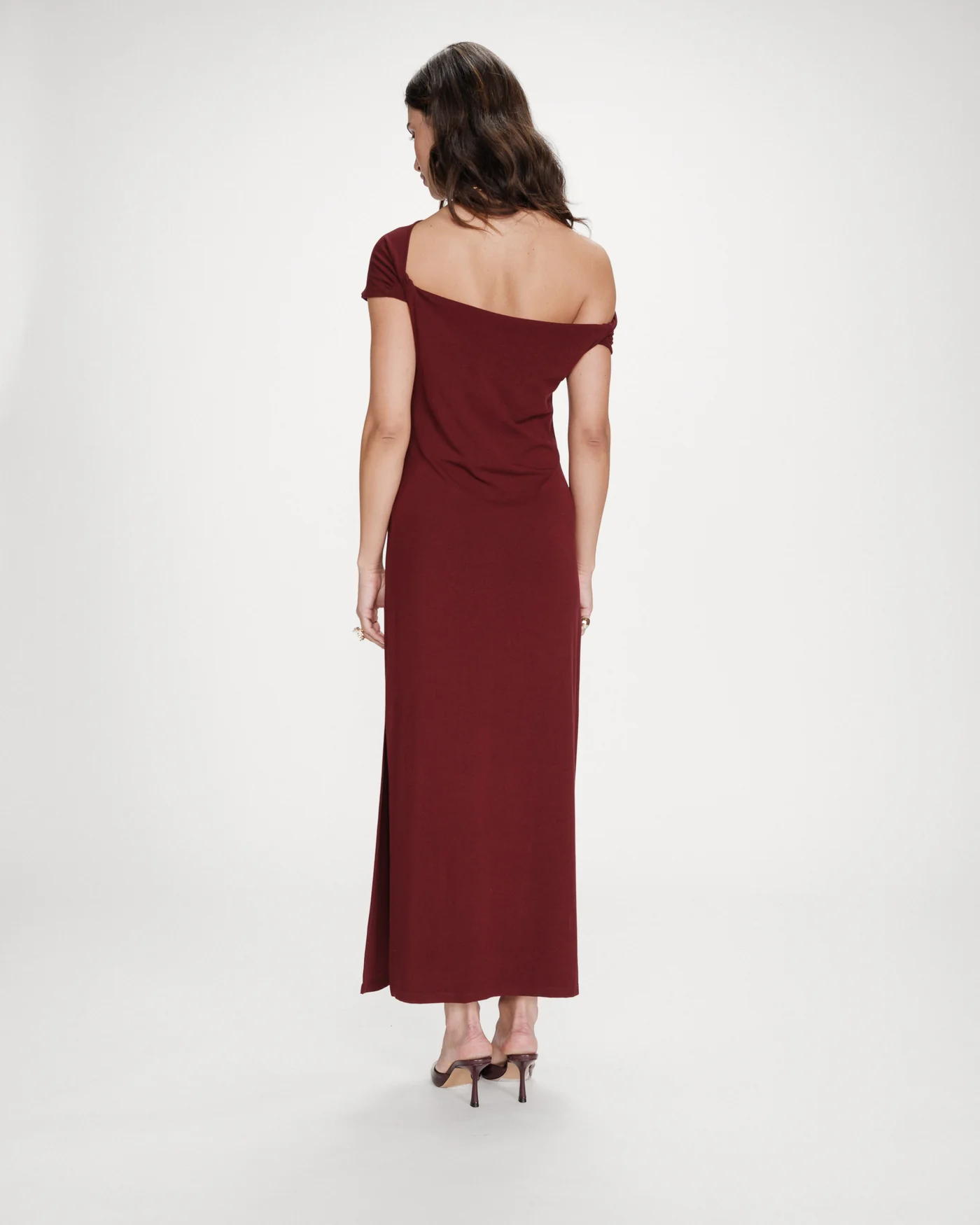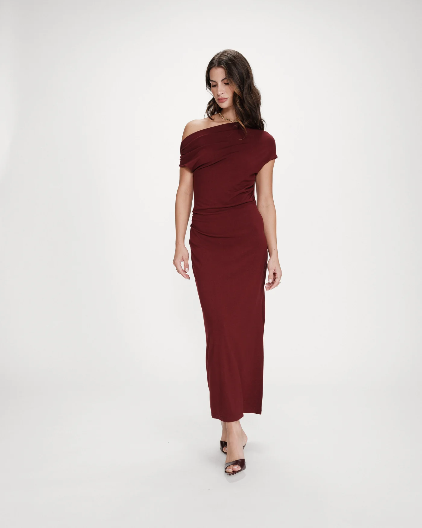 O corte ajustado do vestido longo VANITY é realçado por franzidos nos ombros e na cintura, criando um efeito drapeado elegante e feminino. O modelo, fácil e agradável de usar, é confeccionado em tecido de malha macia. O vestido drapeado VANITY apresenta um decote assimétrico que revela delicadamente um ombro.