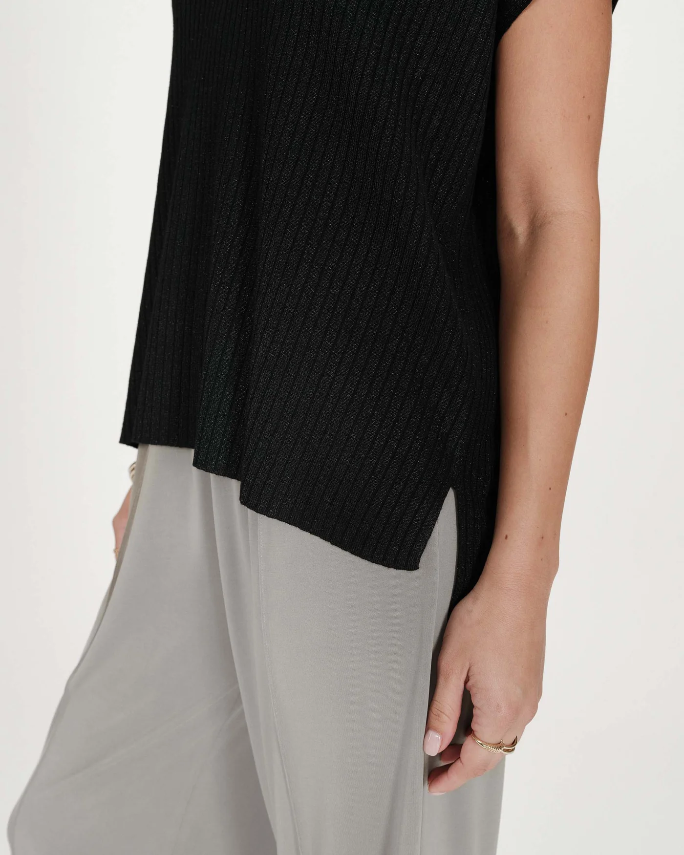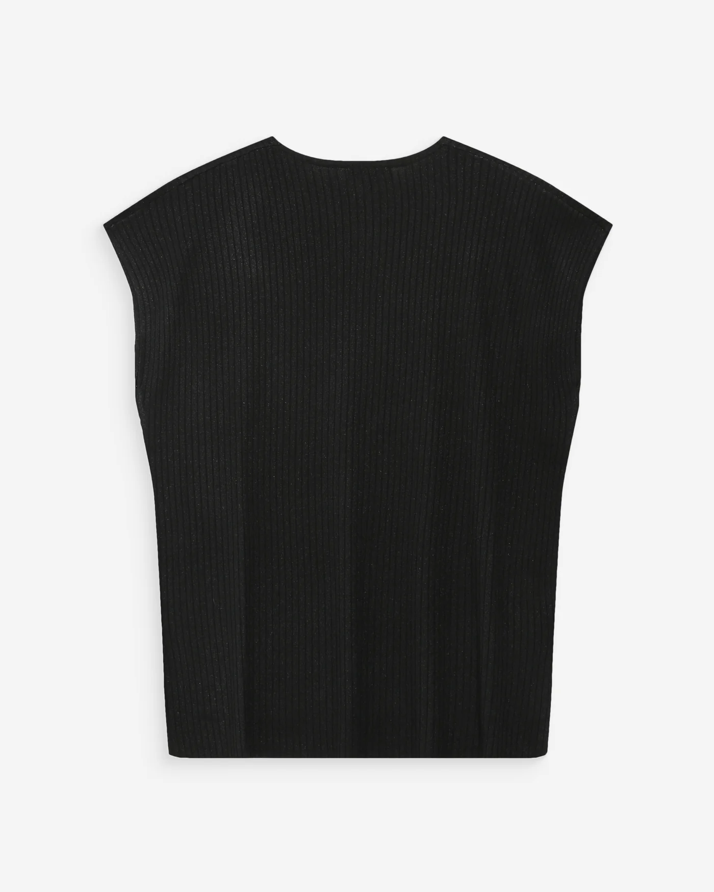 A camiseta VAPORO lurex é uma blusa sem mangas confeccionada em malha canelada. O fio fino, composto por poliéster reciclado e lurex, confere à peça um aspecto luminoso e brilhante. O corte solto e o decote em V da blusa VAPORO valorizam a silhueta feminina.