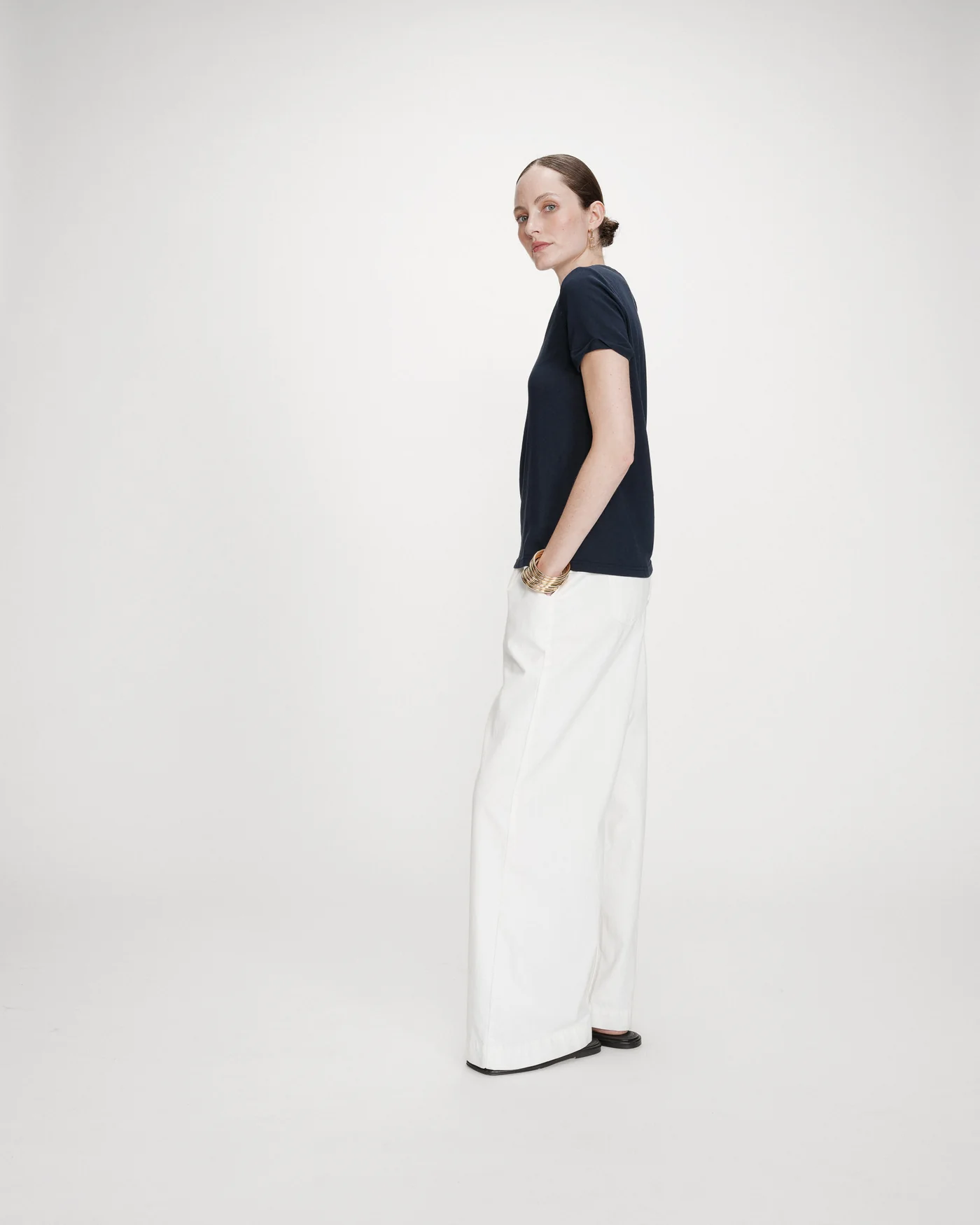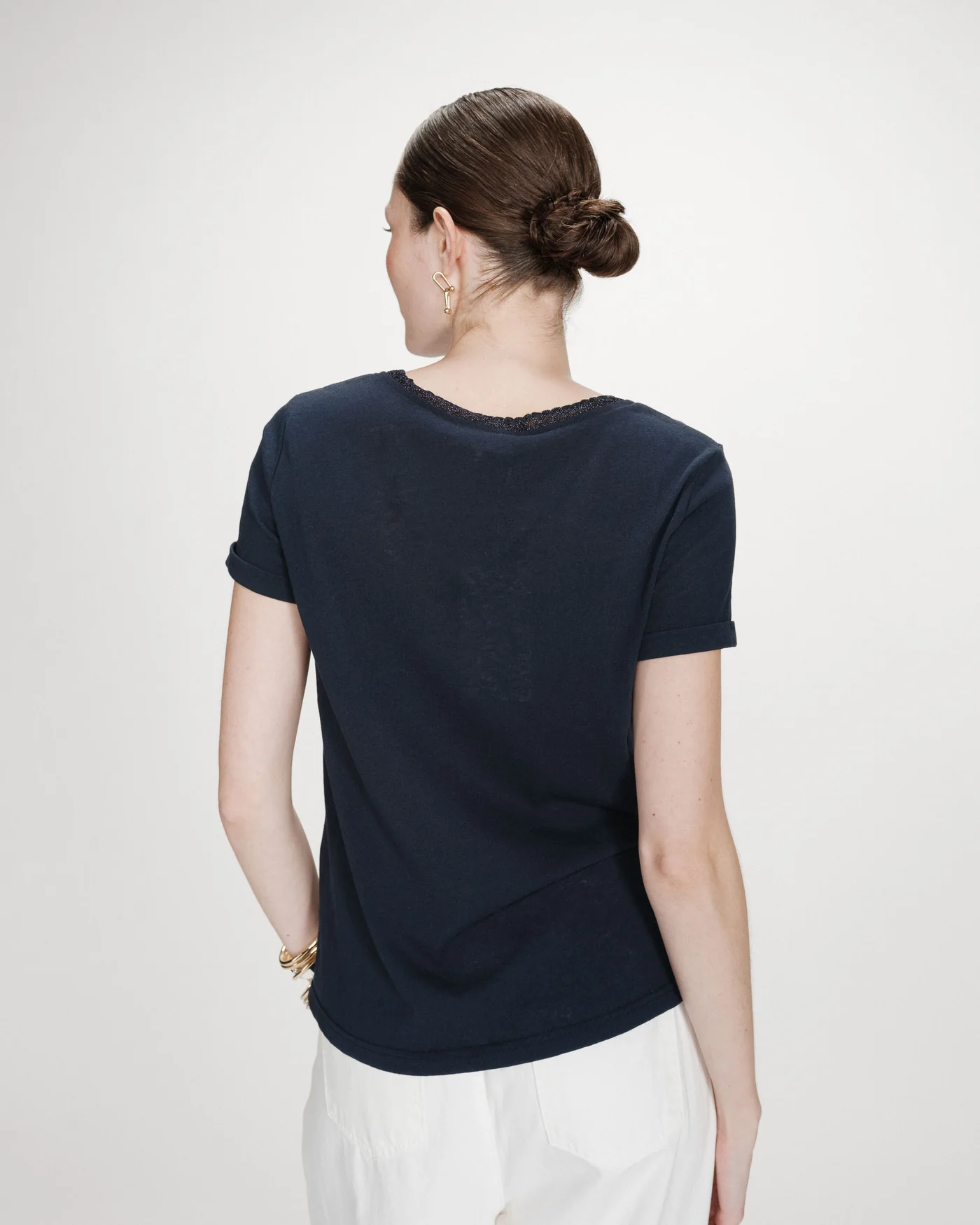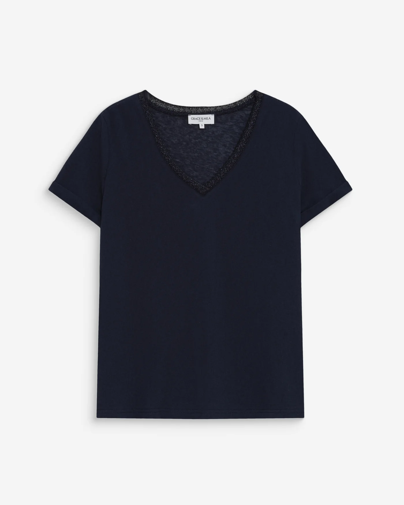 A camiseta de manga curta VASCO apresenta um acabamento em lurex ao longo do decote em V, valorizando o colo. A camiseta VASCO com decote em V tem mangas curtas e corte reto, tornando-se uma peça essencial da coleção.
