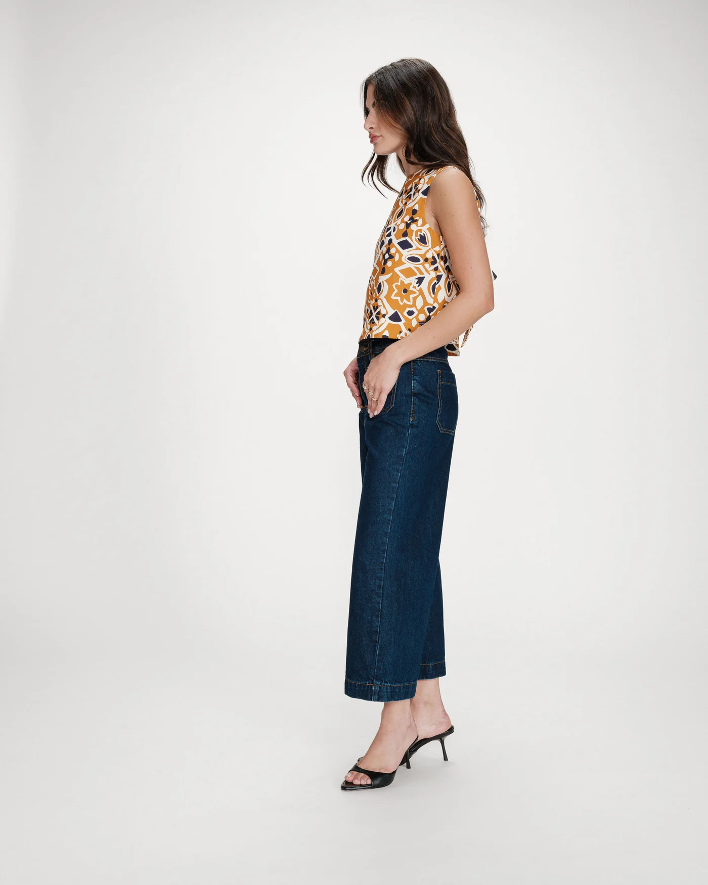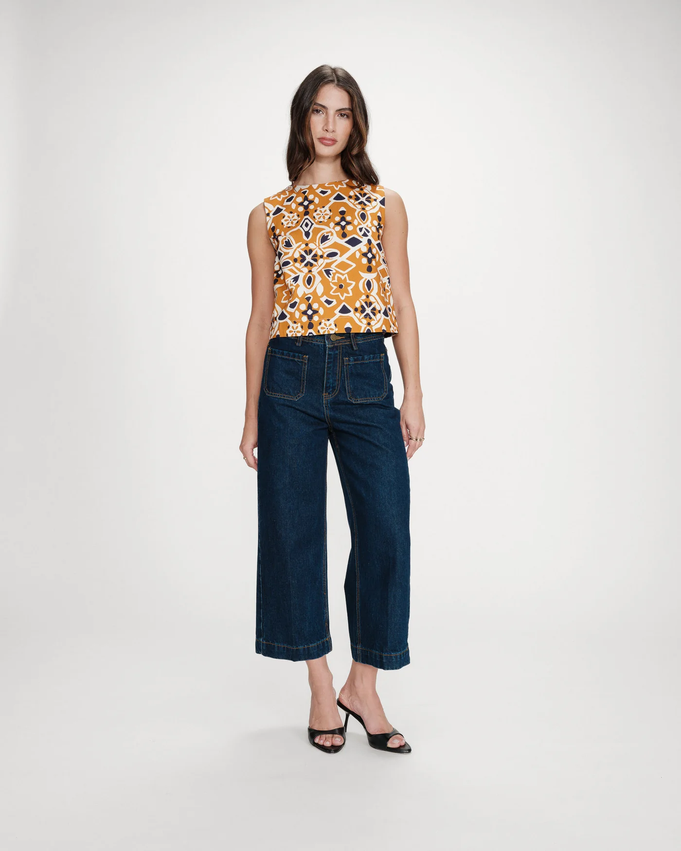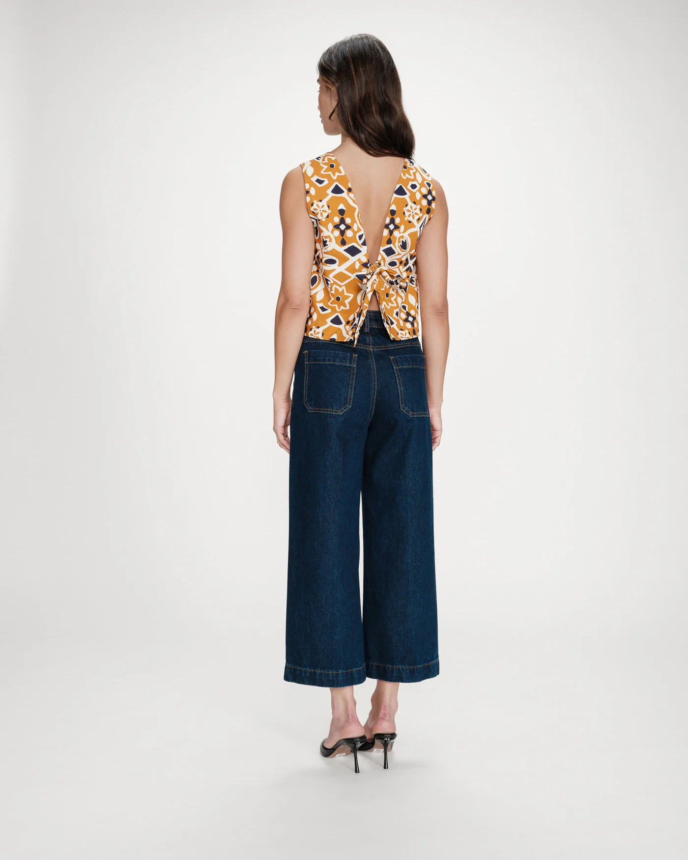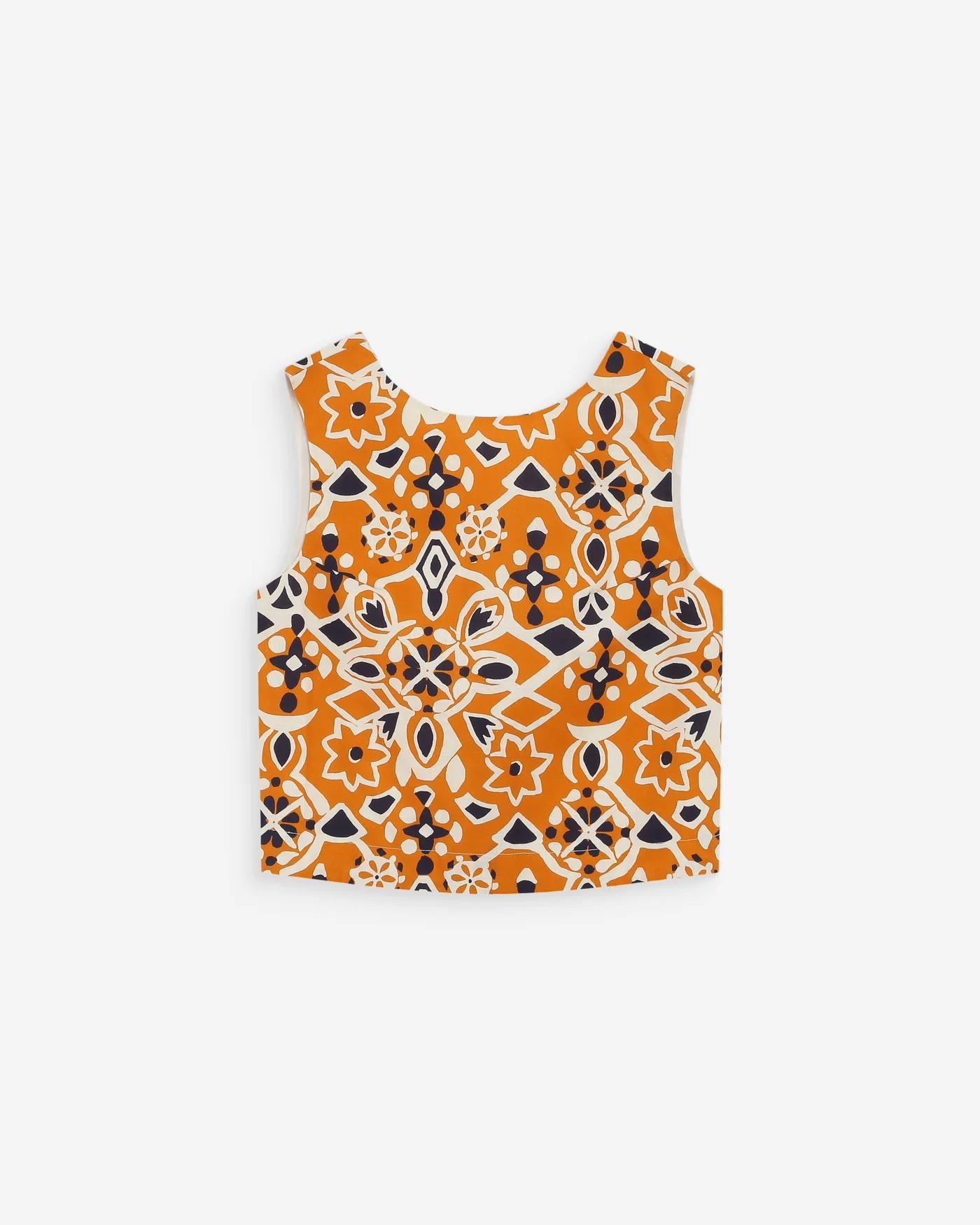 O corte curto e reto da blusa sem mangas VENISE é realçado por uma estampa gráfica em tons quentes e contrastantes. As costas abertas fecham com um laço, criando uma silhueta feminina e sensual. A blusa estampada VENISE é uma peça ousada e marcante da coleção.