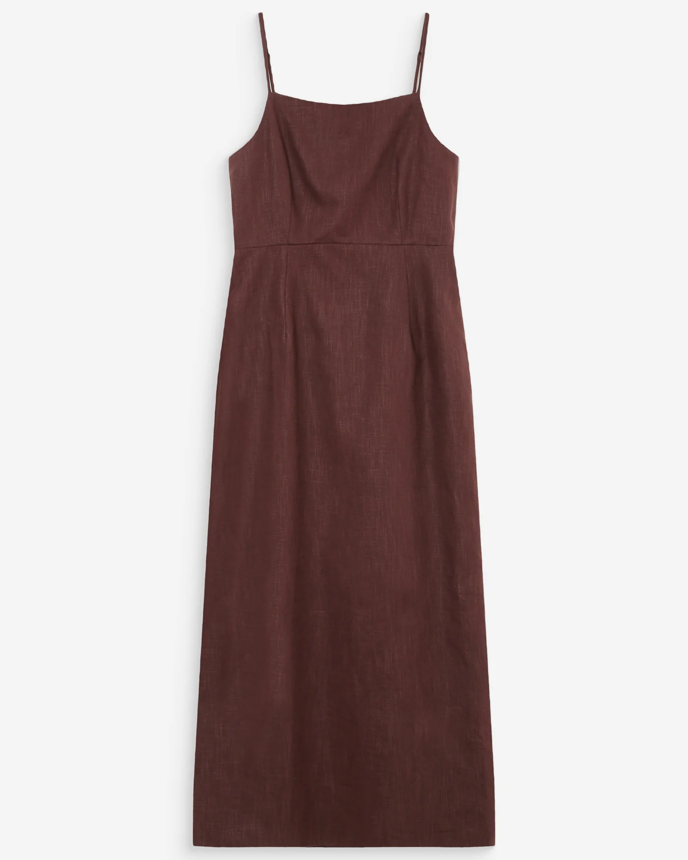 O vestido longo VERANYS , confeccionado em uma mistura de linho e algodão, oferece uma silhueta simples e minimalista. O modelo apresenta um corte ajustado, decote quadrado e alças finas para uma elegância moderna. O vestido de linho VERANYS possui forro completo.