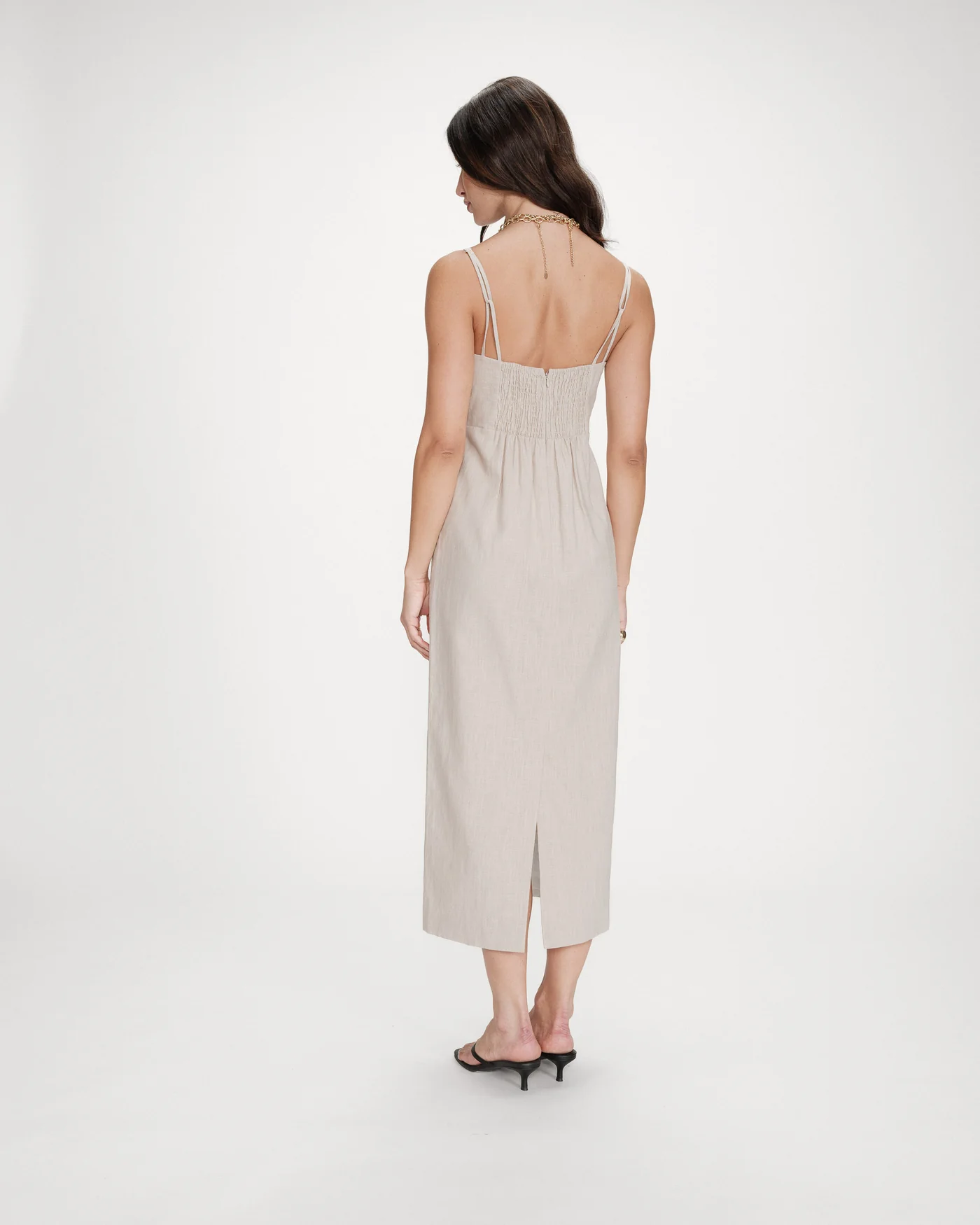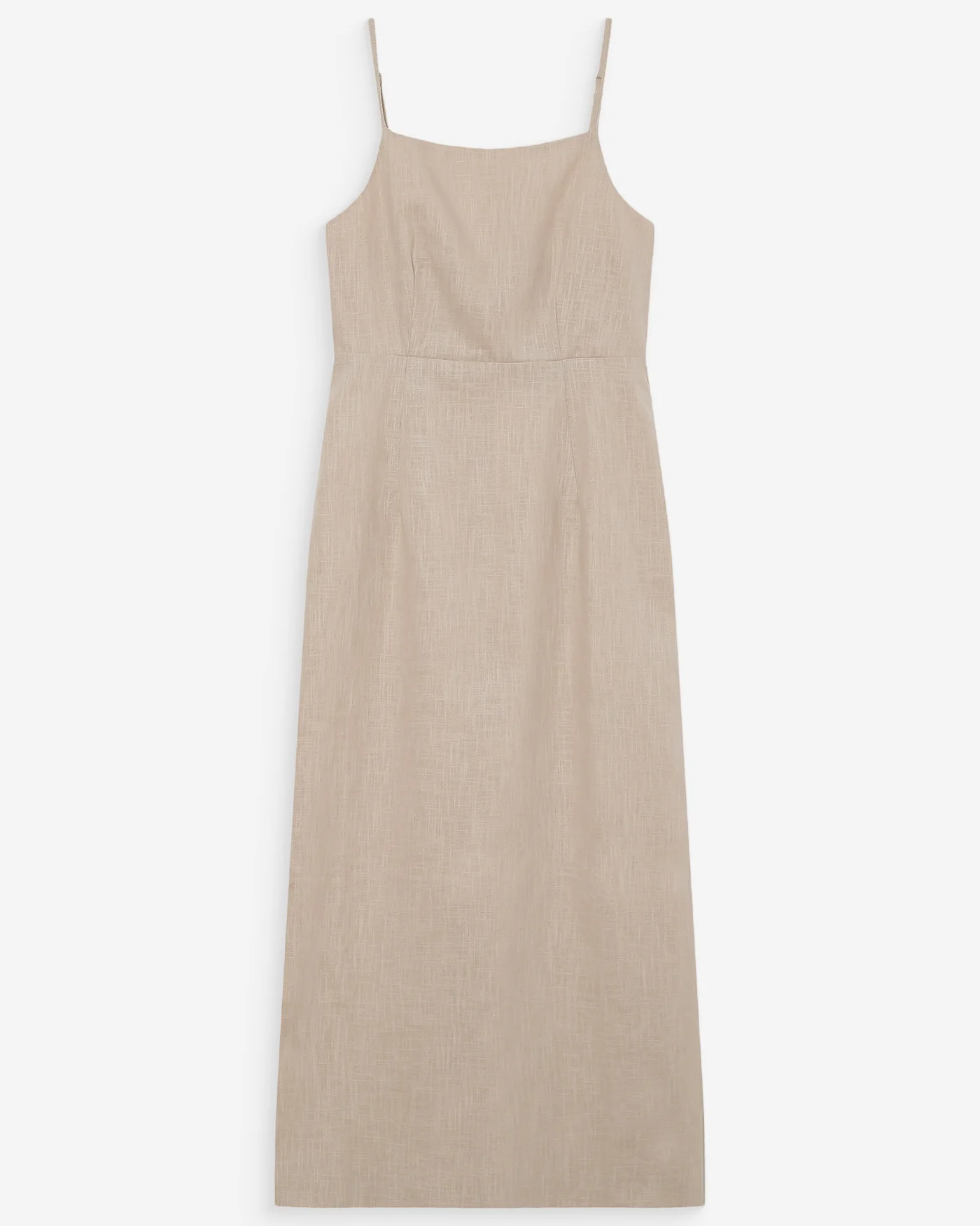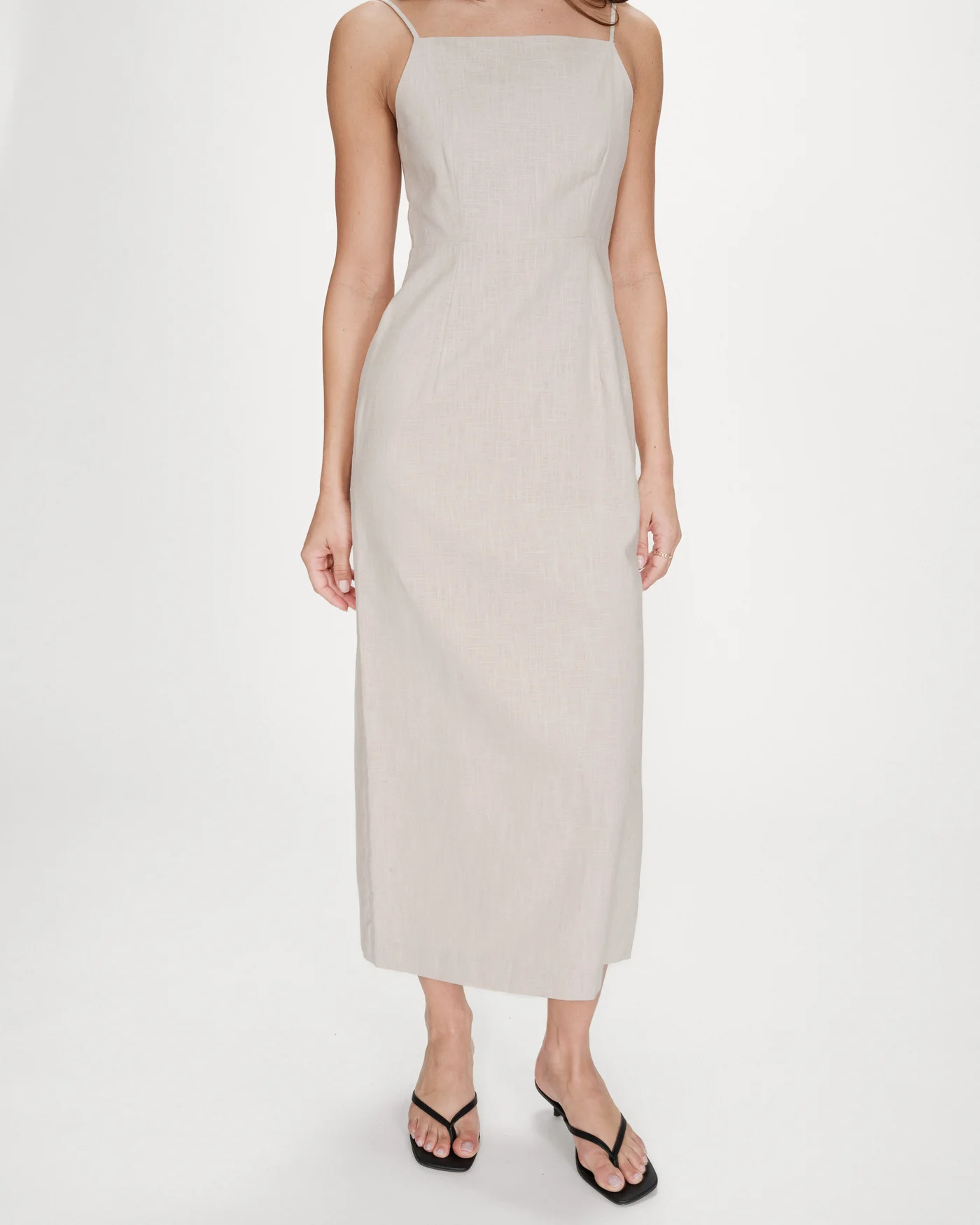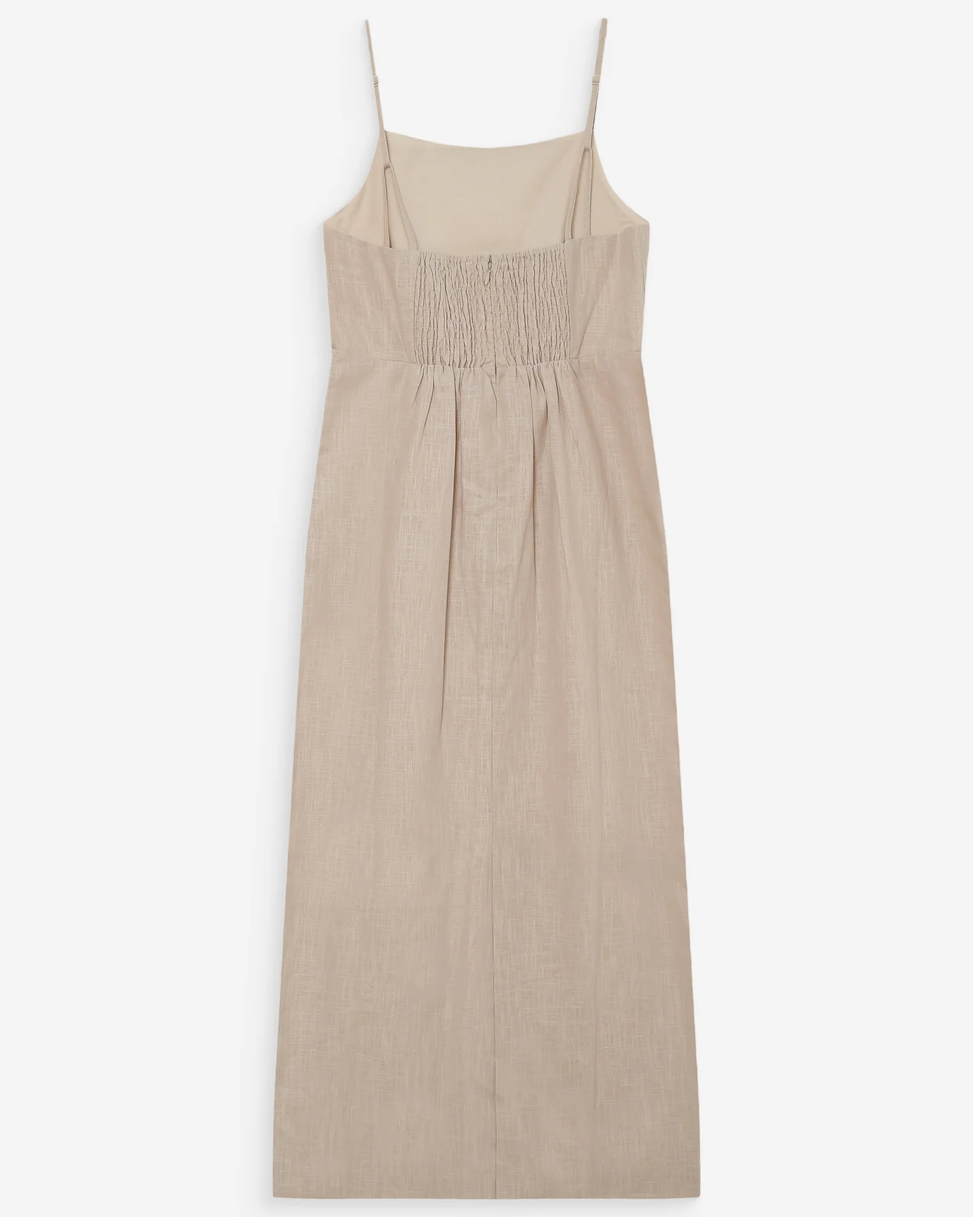 O vestido VERANYS em mistura de linho e algodão apresenta uma silhueta minimalista e elegante. O corte ajustado e o decote quadrado criam um visual feminino moderno, enquanto as alças finas e as costas franzidas acrescentam leveza e sofisticação.