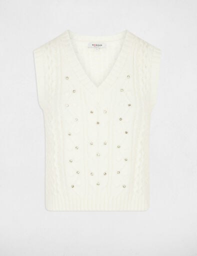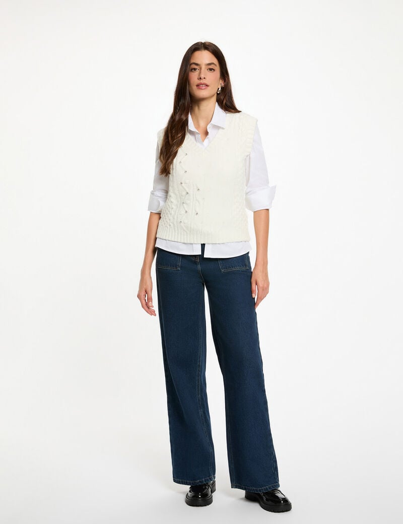 O colete VETI apresenta corte ajustado e comprimento cropped que valoriza a silhueta. As pedras aplicadas acrescentam um toque luminoso e sofisticado.