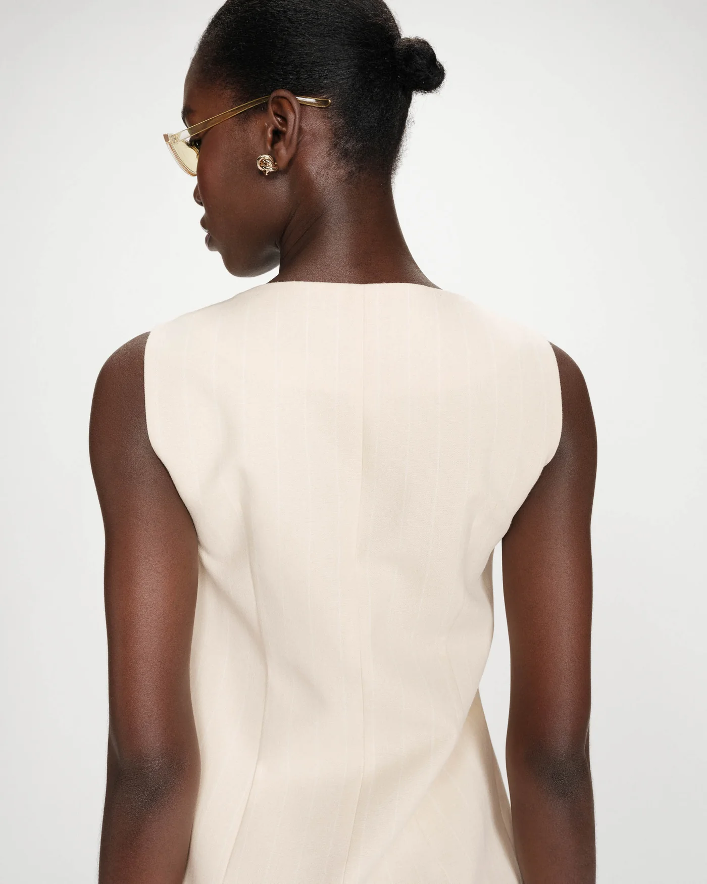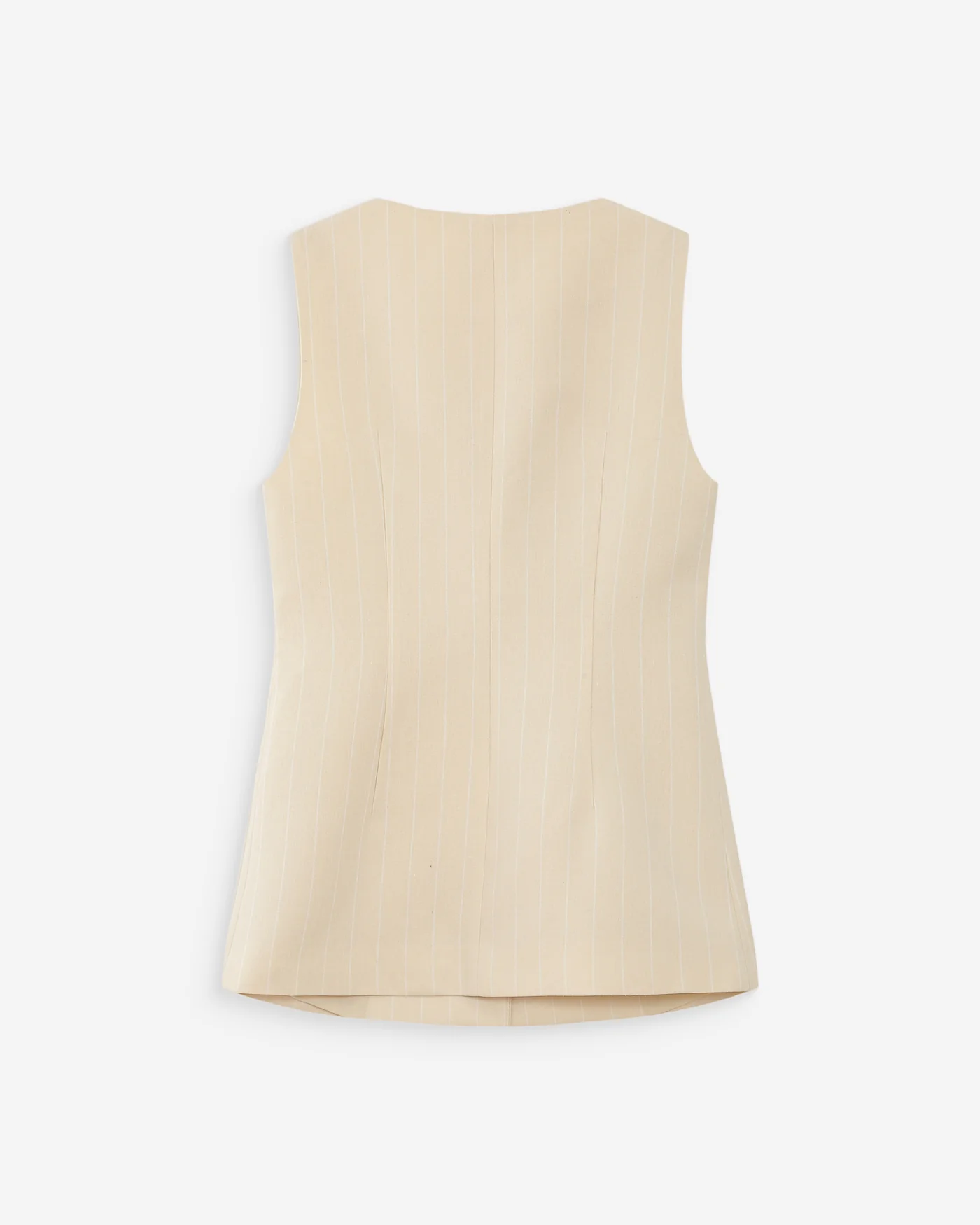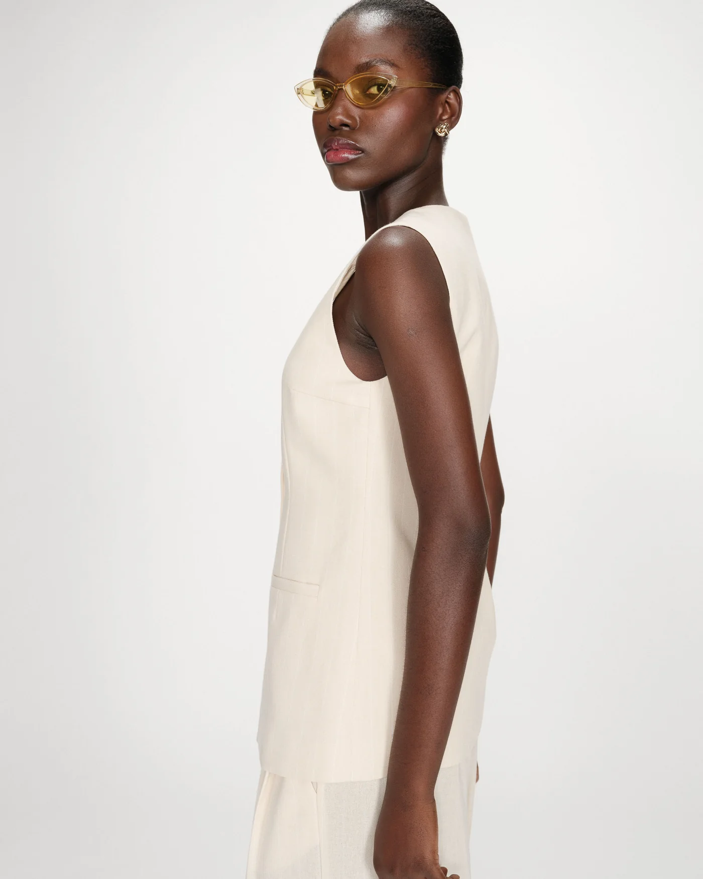 O colete sem mangas VIC , confeccionado em tecido misto de linho, é uma peça moderna e elegante. O design é estruturado, com corte ajustado e decote quadrado. O colete de linho VIC apresenta bolsos embutidos e botões G&M gravados na parte frontal, o que o torna uma peça refinada e de excelente acabamento.