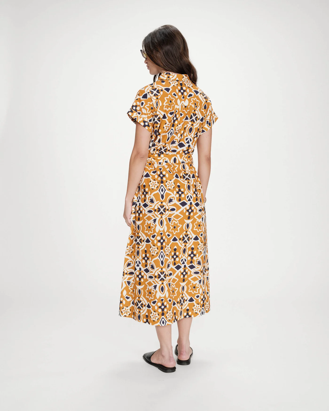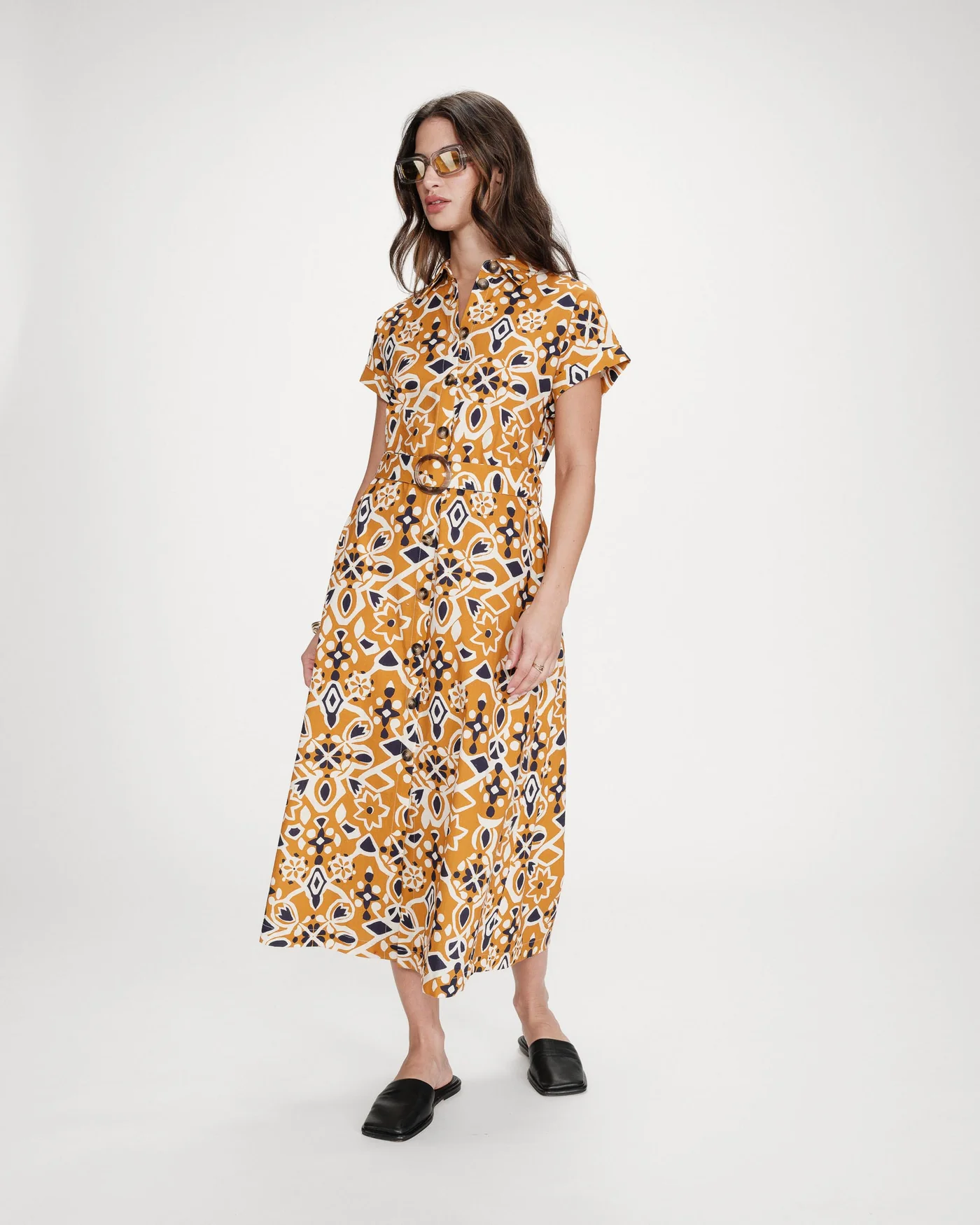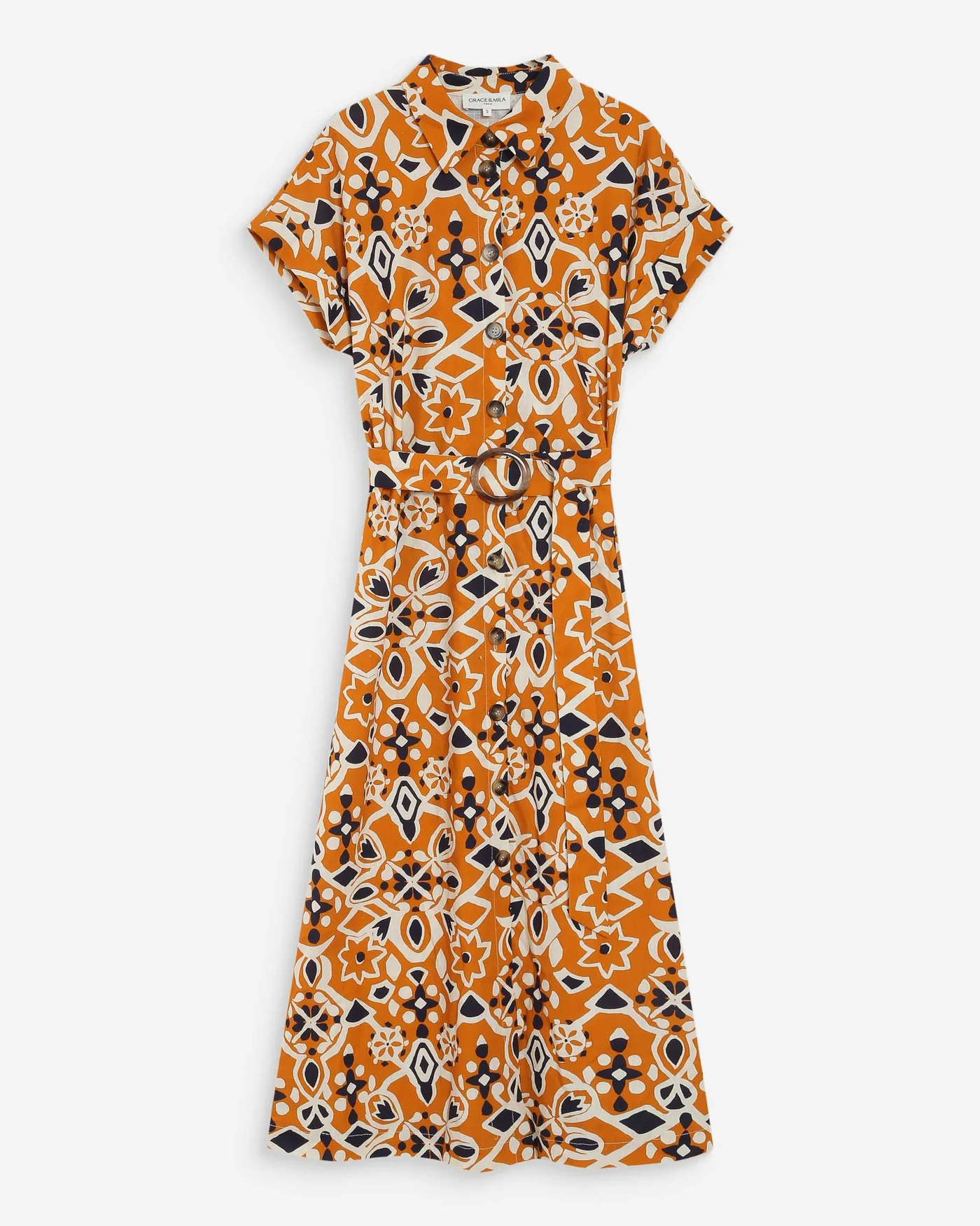 O vestido camiseiro VIRGINIA é confeccionado em 100% algodão com estampa inspirada na Sicília. O corte evasê é acentuado por um cinto com fivela na cintura, que valoriza a silhueta. O vestido estampado VIRGINIA possui mangas curtas com punhos, fechamento frontal com botões e bolsos laterais.