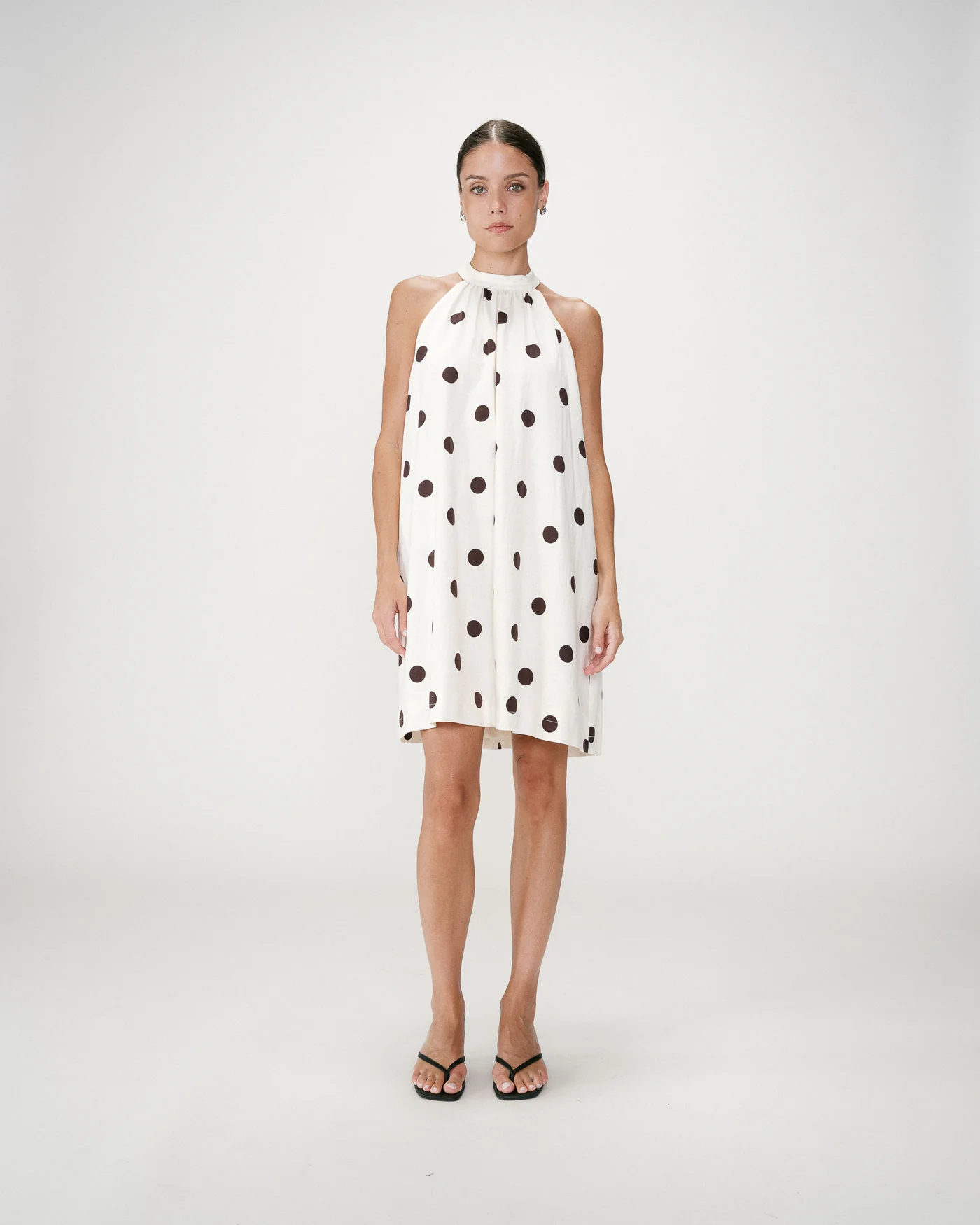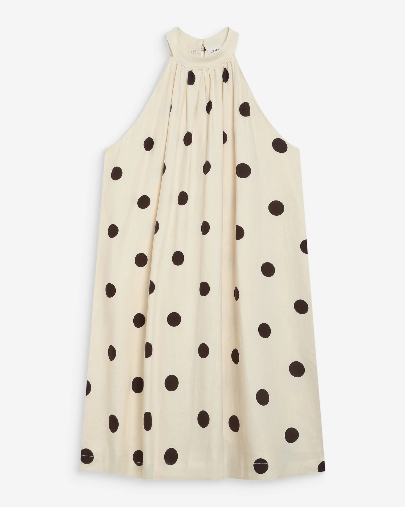 O Warna Polka Dot Dress é uma peça de elegância intemporal com um toque feminino e leve. O padrão de bolas e o corte ligeiramente evasé criam movimento, enquanto o decote halter com detalhe de botões acrescenta sofisticação.