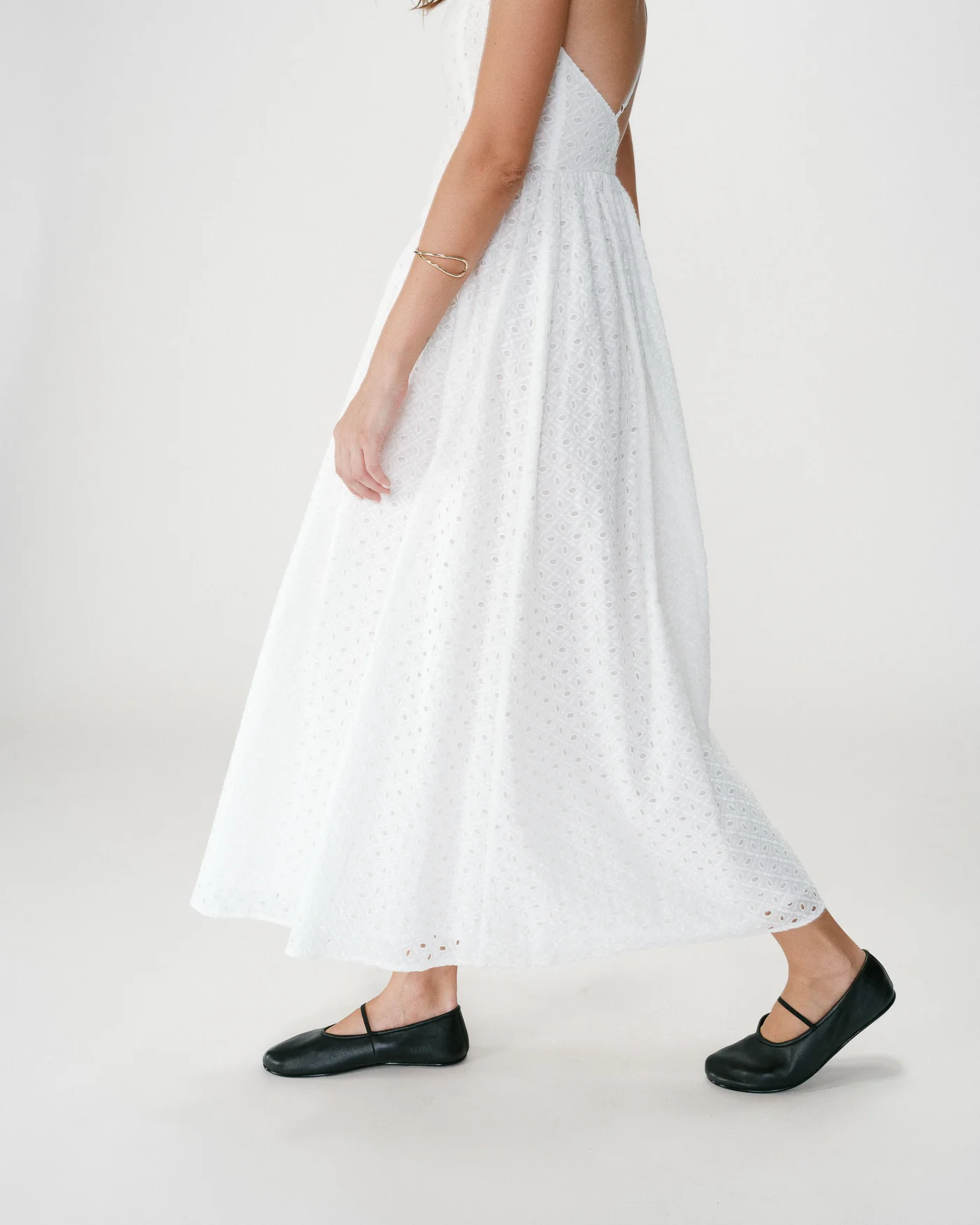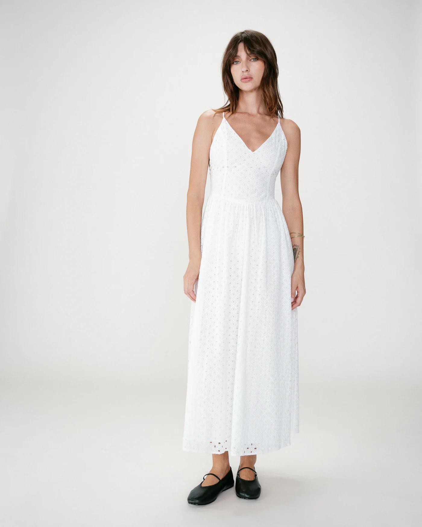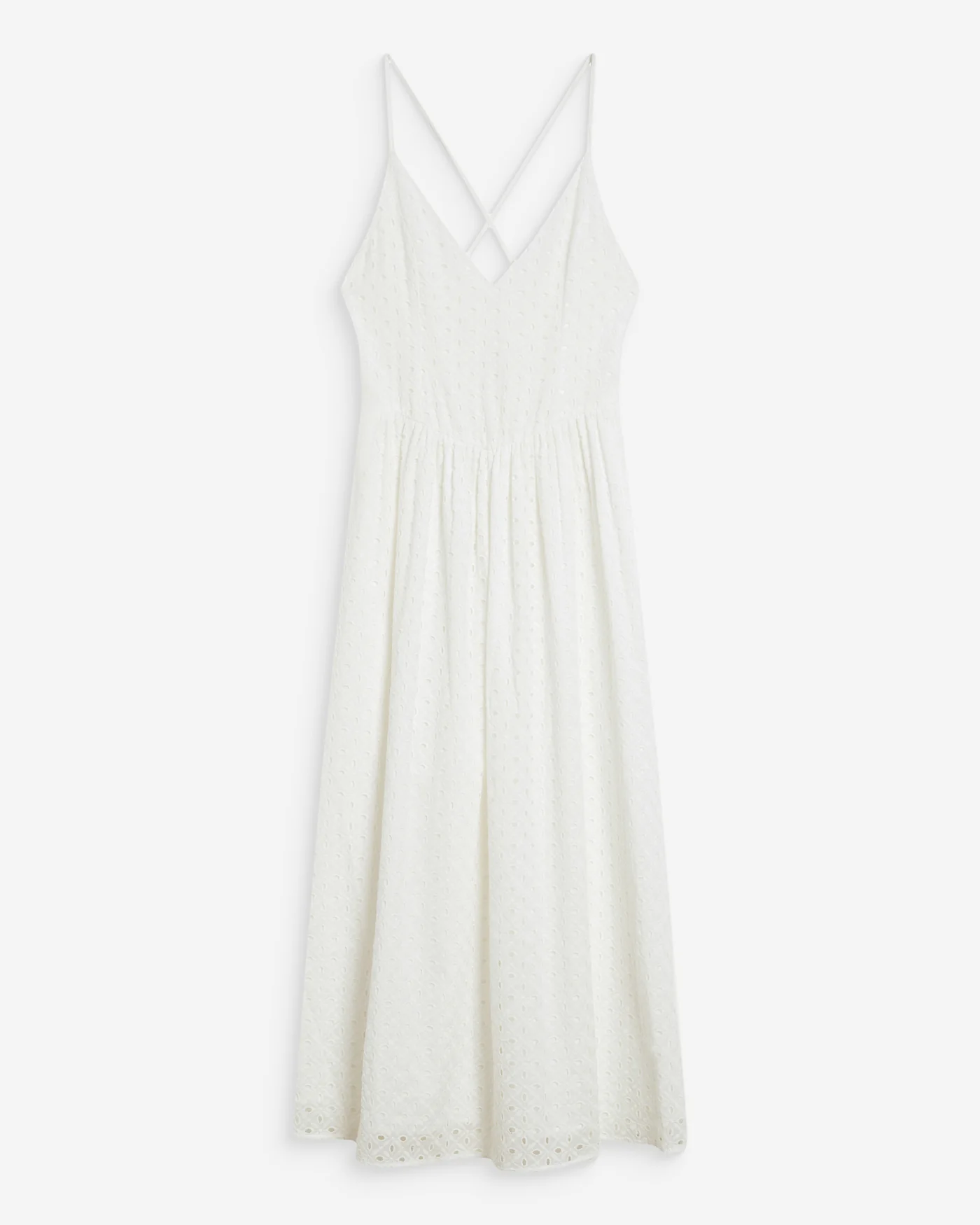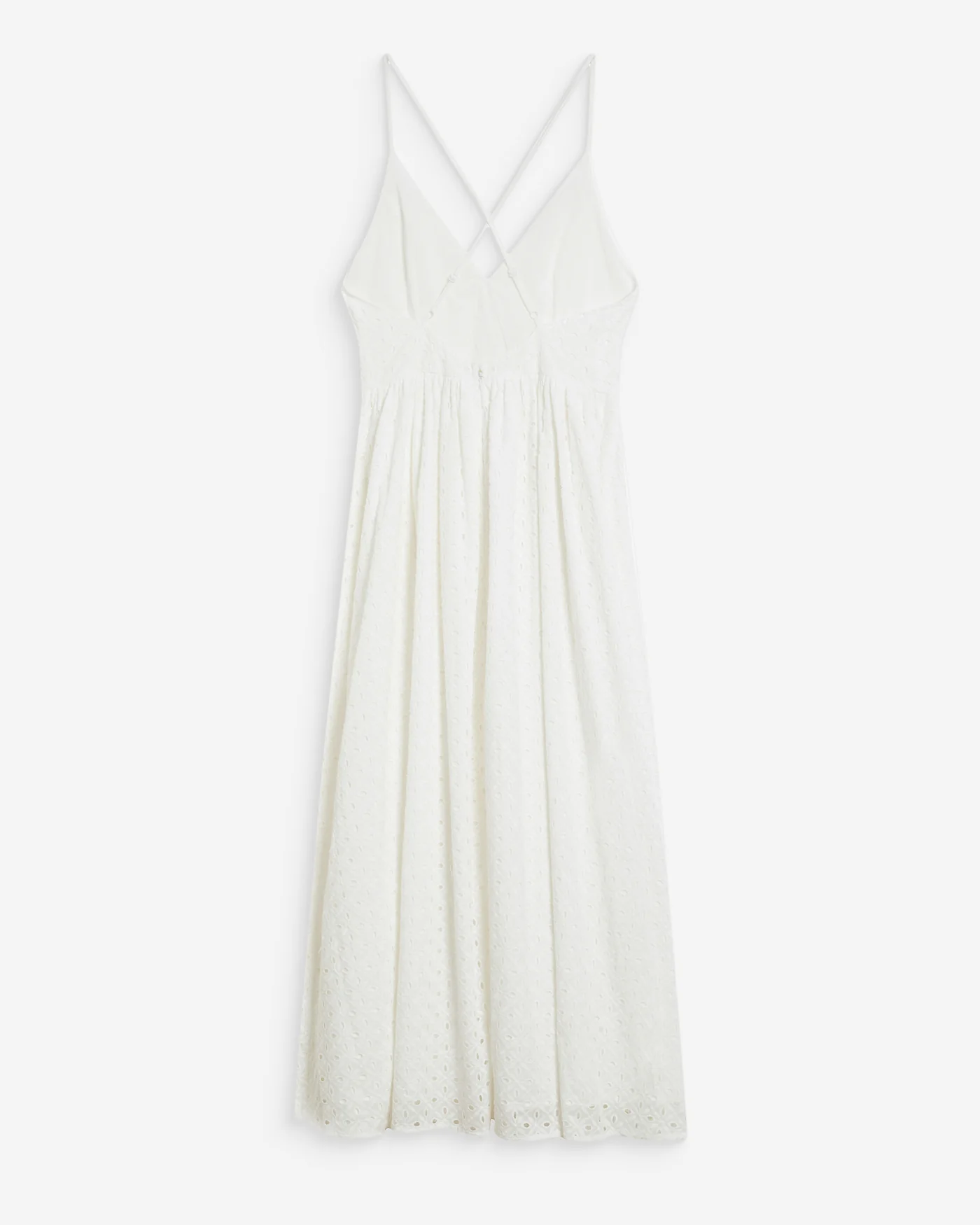 O Wimala Embroidered Long Dress é uma peça romântica e elegante com bordado inglês. O decote em V e as costas abertas com alças cruzadas criam uma silhueta feminina e leve.