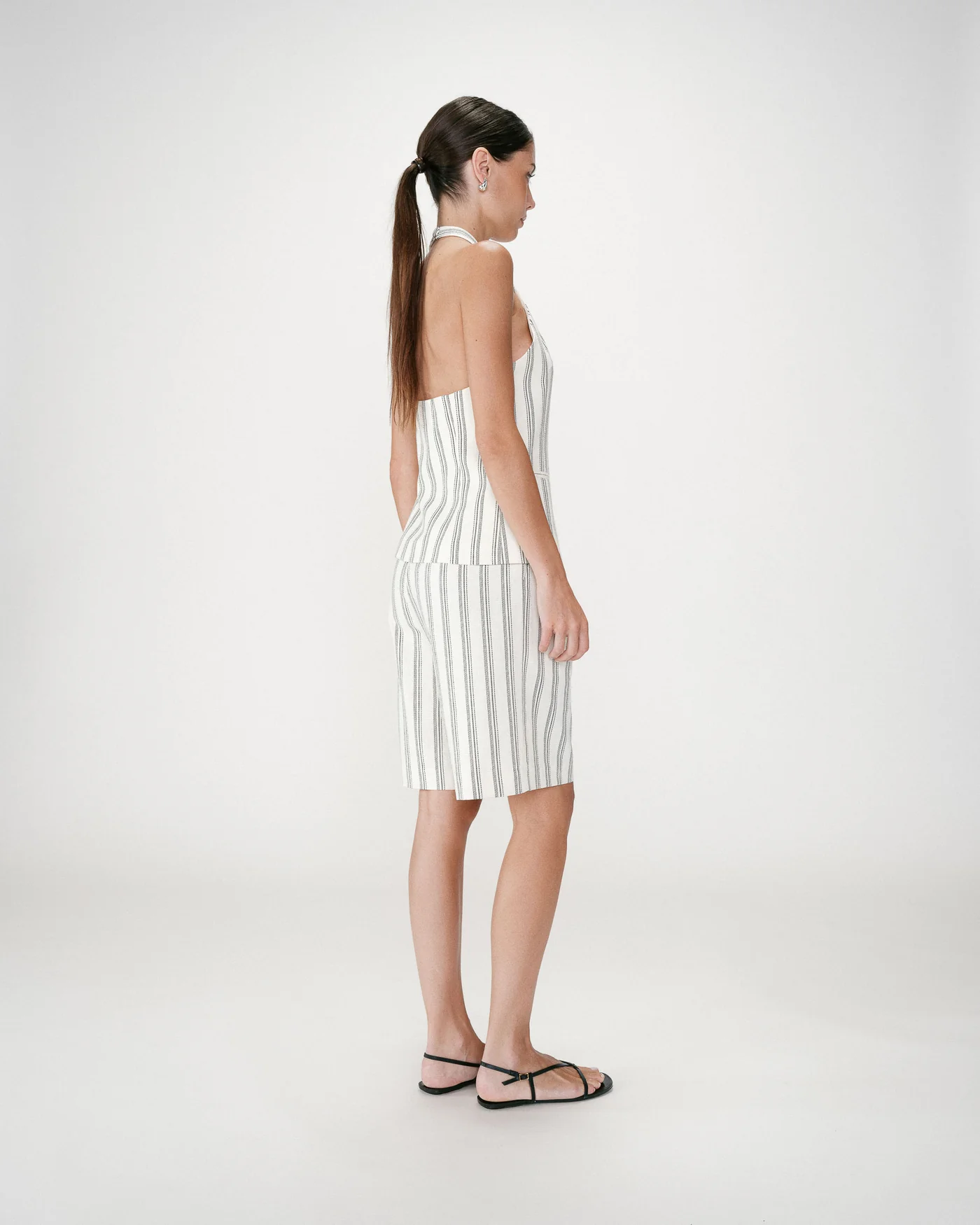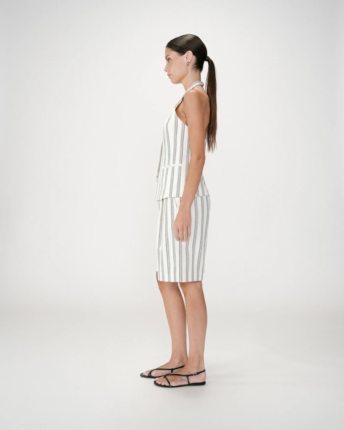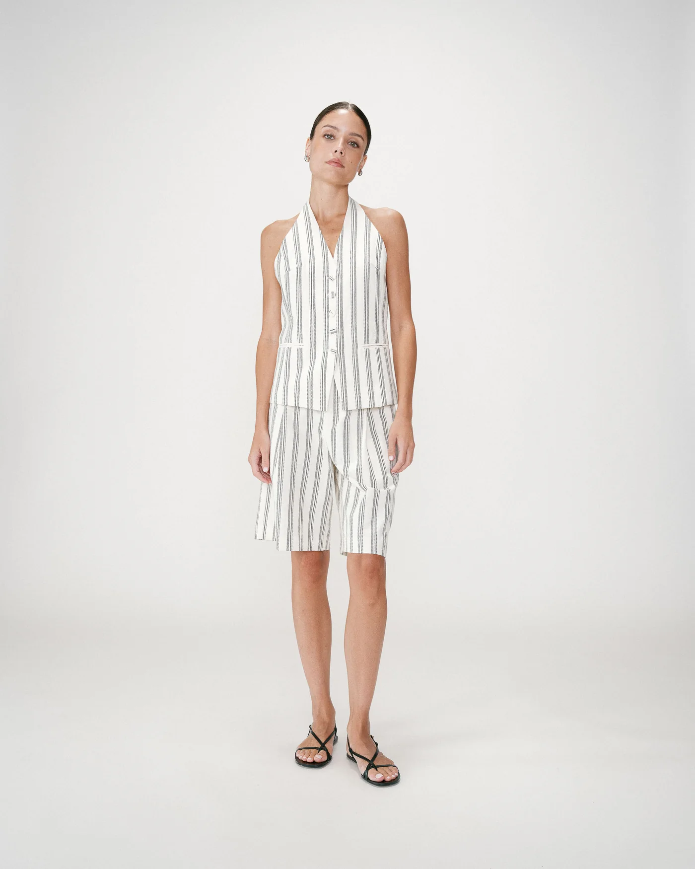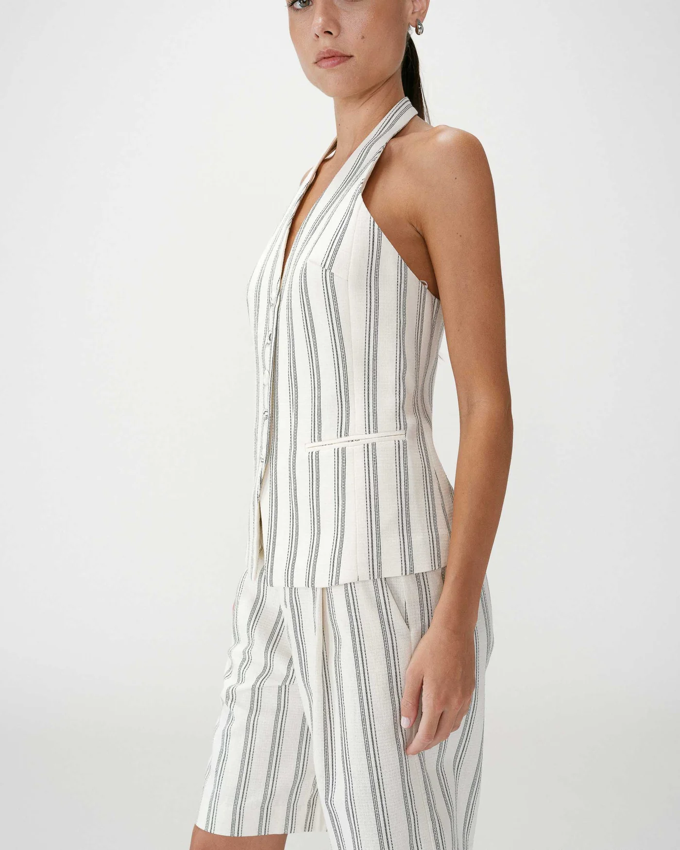 O Winika Backless Striped Vest é uma peça de forte identidade que combina alfaiataria e sensualidade subtil. O corte ajustado valoriza a silhueta, enquanto o decote em V nas costas e o design aberto criam um efeito elegante e contemporâneo.