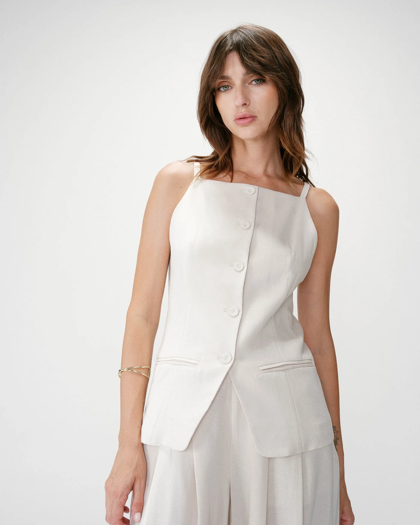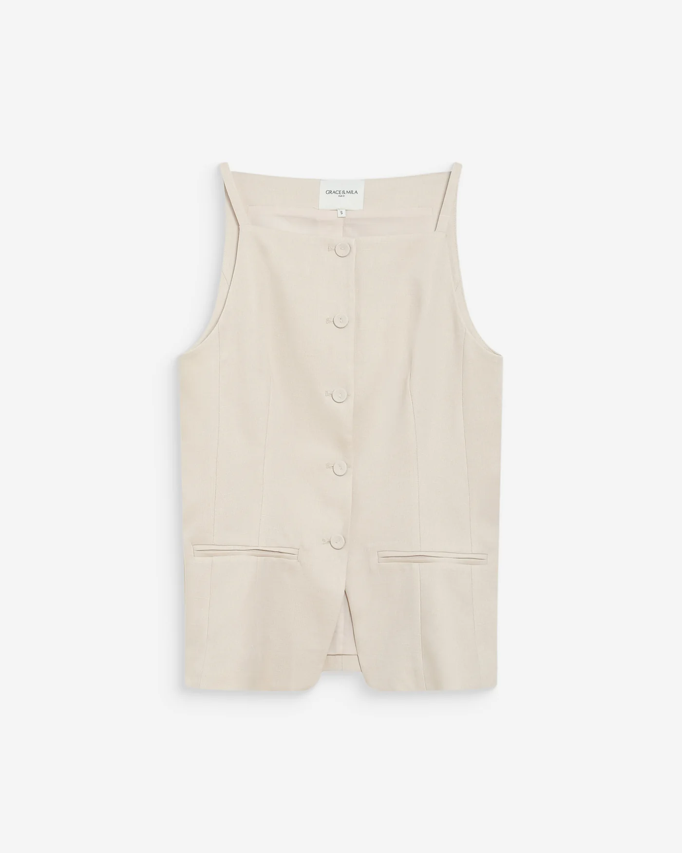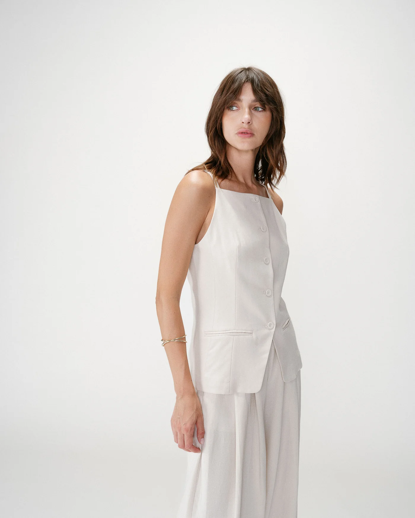 O Winston Tailored Vest traduz uma elegância minimalista com inspiração na alfaiataria. O decote quadrado e as linhas limpas criam uma silhueta moderna, enquanto os botões forrados e o corte estruturado acrescentam sofisticação.