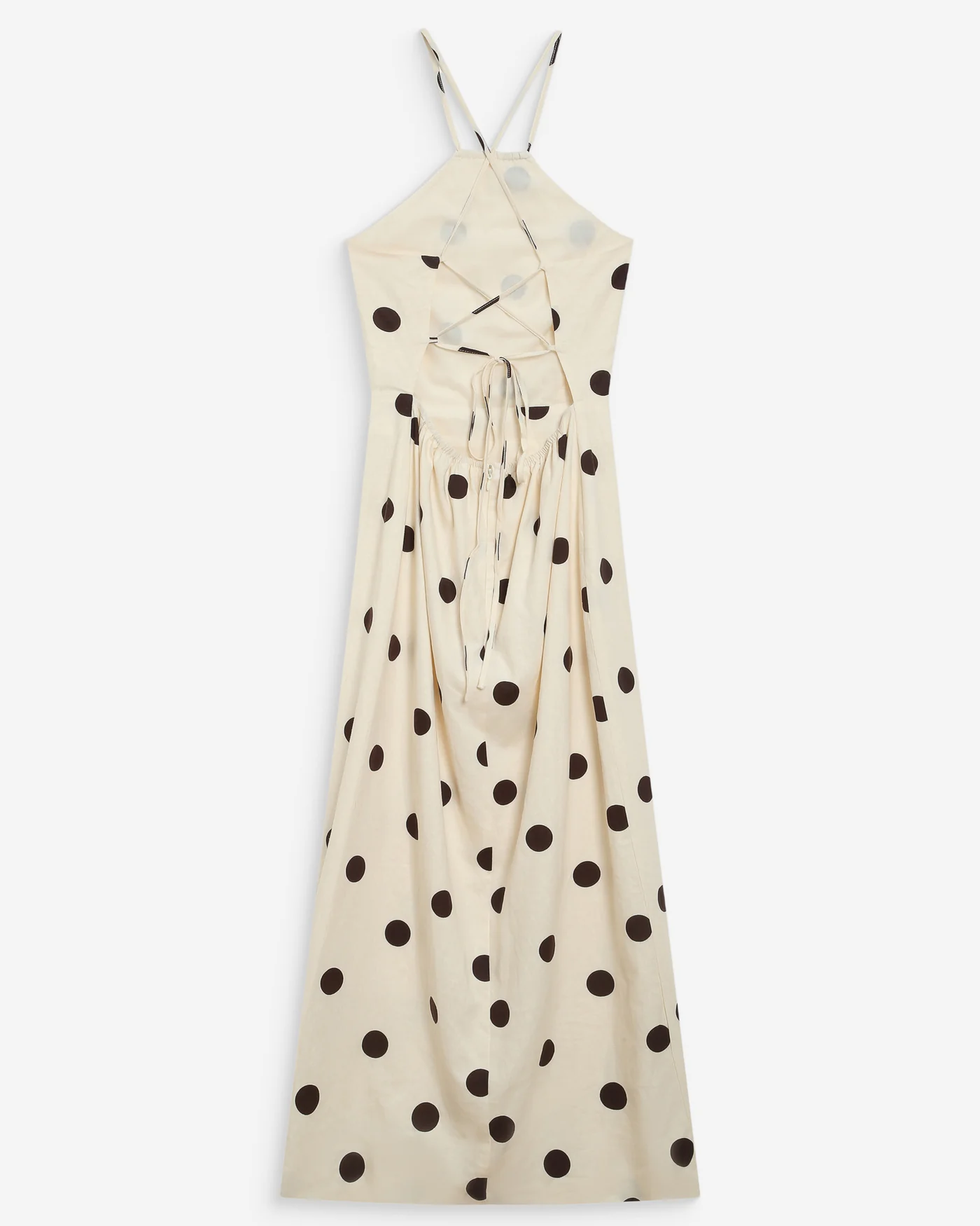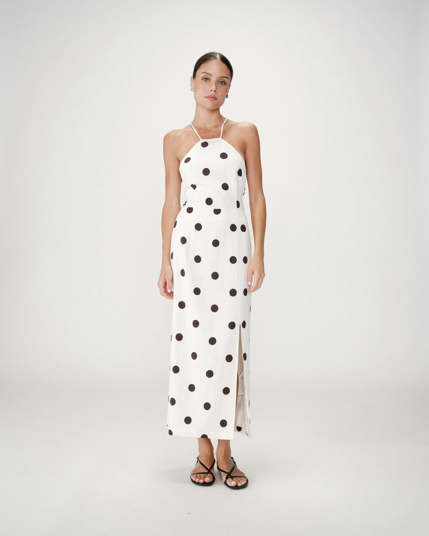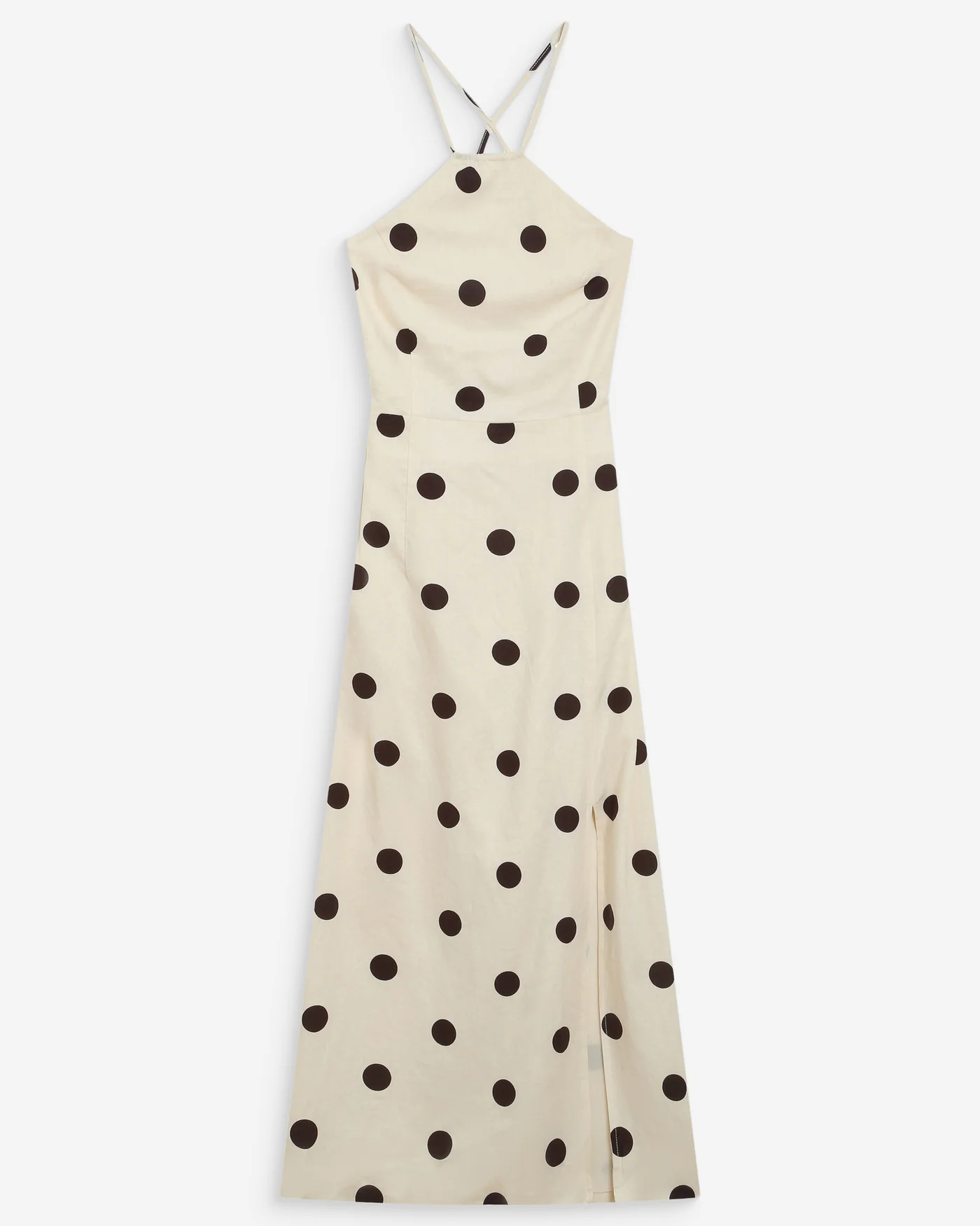 O Wyella Polka Dot Dress traduz uma elegância intemporal com um toque contemporâneo. O corte ajustado e a fenda frontal valorizam a silhueta, enquanto o decote halter com laços cria um detalhe sofisticado.