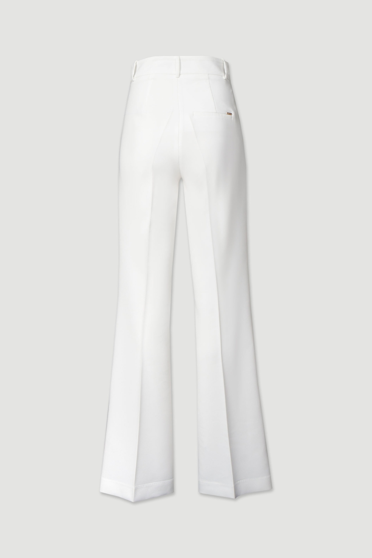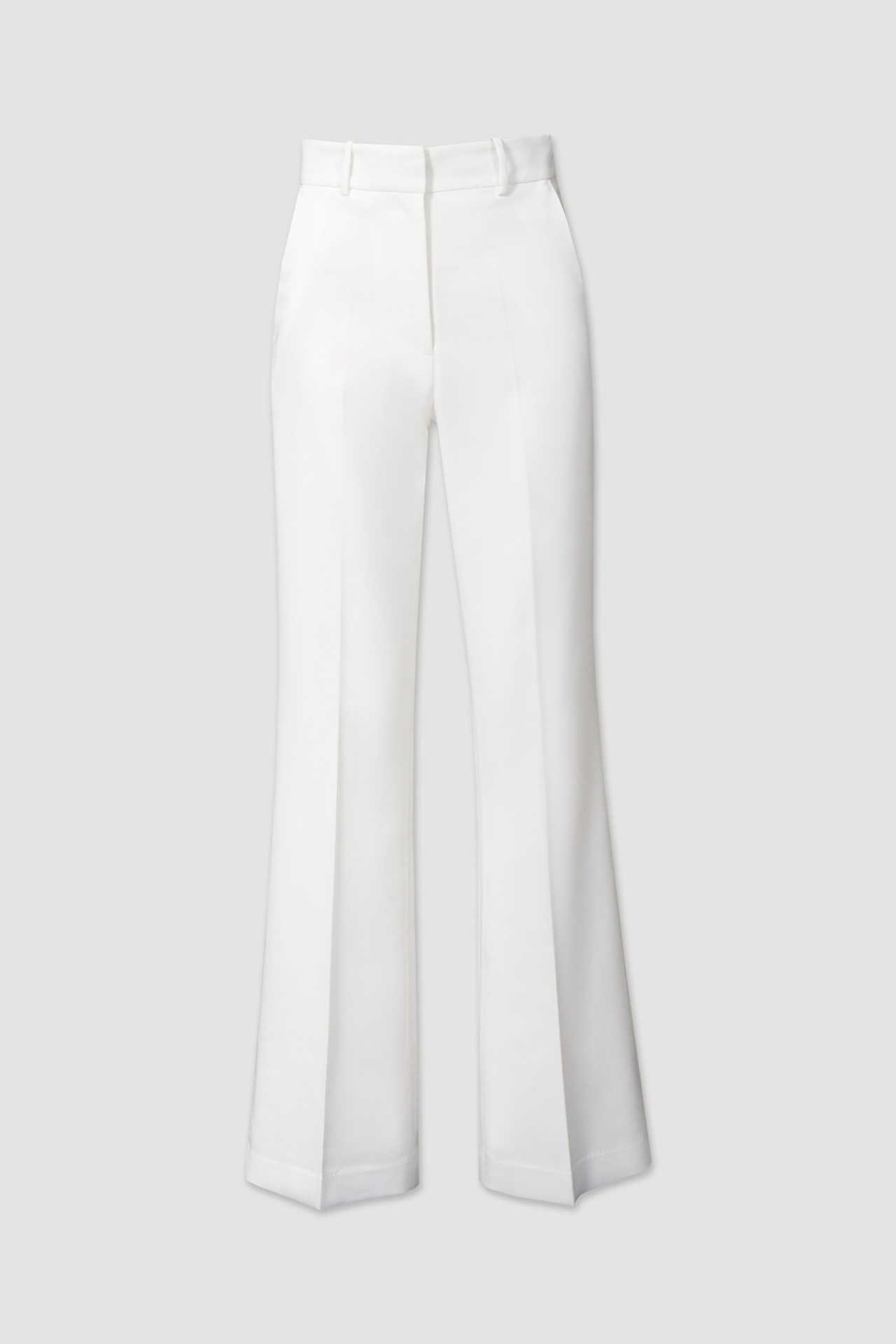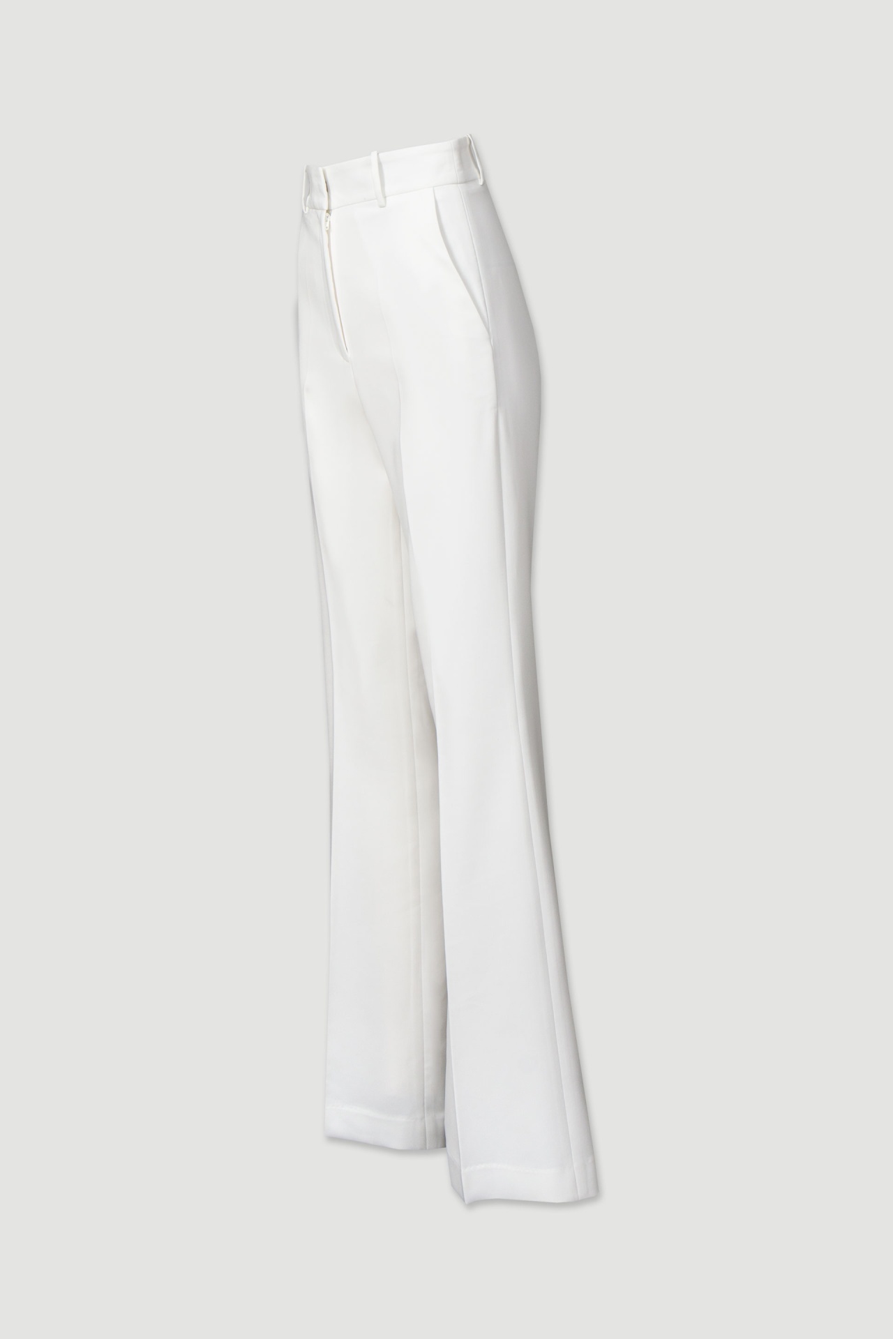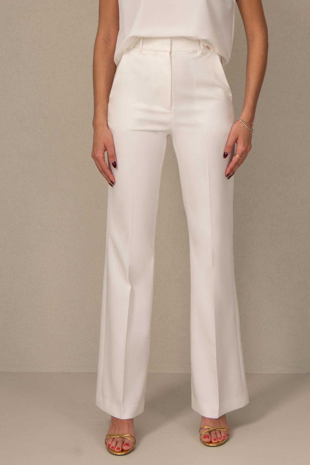 Calça flare de cintura subida. Possui bolsos frontais funcionais e detalhes de presilhas para cinto. Apresenta fecho de correr na frente com gancho metálico e botão interior, garantindo um ajuste perfeito.
