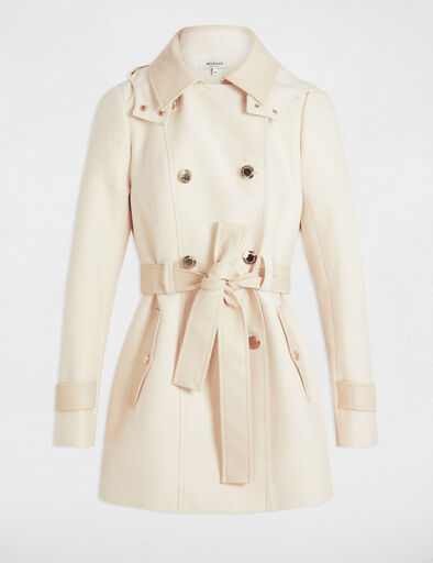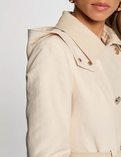 Casaco gabardine, com detalhes em pele sintética. Corte cintado, colarinho lapela, botões de fileira dupla na frente. Dois bolsos com pala e botão. Botão e tira nos punhos. Detalhes com efeito croco junto ao decote, cinto, punhos e bolsos.